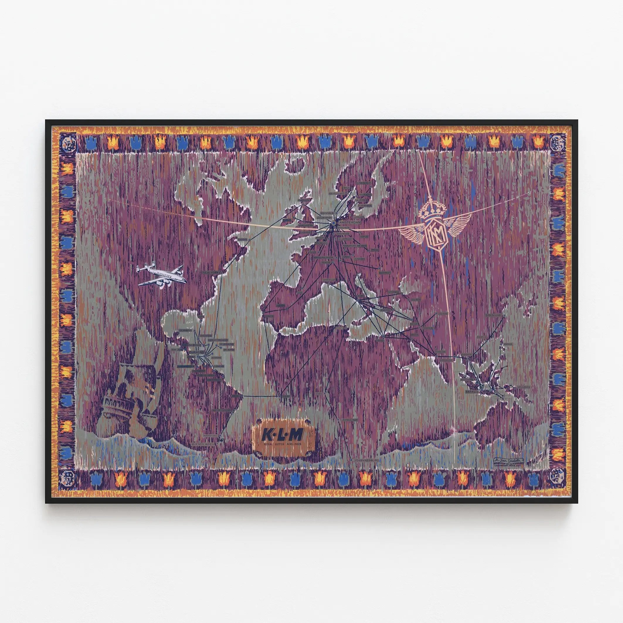 Deze vintage poster toont een wereldkaart die het luchtvaartnetwerk van KLM Koninklijke Nederlandse Luchtvaart Maatschappij illustreert. Ideaal voor luchtvaartliefhebbers en verzamelaars van originele wanddecoratie, deze affiche benadrukt de verschillende vliegroutes die Amsterdam verbinden met diverse steden wereldwijd. Op een gekleurd achtergrond die tinten van paars, oranje en blauw combineert, toont de kaart de continenten Europa, Azië, Afrika, Noord-Amerika en Zuid-Amerika, met een bijzondere nadruk op de routes van de luchtvaartmaatschappij. De zwarte lijnen geven de hoofdvliegroutes weer, terwijl het iconische KLM-logo rechtsboven zichtbaar is, vergezeld van een gevleugeld gekroond embleem. Aan de linkerkant is ook een vintage vliegtuig afgebeeld, dat herinnert aan het historische tijdperk van de commerciële luchtvaart. De rand van de poster is versierd met een gekleurd geometrisch patroon dat dit wandkunstwerk mooi omlijst. Deze poster is een perfecte decoratieve keuze voor een interieur in retro-, industriële stijl of om een vleugje vintage charme toe te voegen aan een ruimte die aan reizen gewijd is. Ideaal om te hangen in een woonkamer, kantoor of slaapkamer, trekt het de aandacht door zijn zorgvuldig uitgewerkte grafische details en fascinerende luchtvaartwereld. Dit wandpaneel combineert geschiedenis en esthetiek om uw muren om te toveren tot een ware ode aan een iconisch tijdperk van luchtvervoer.