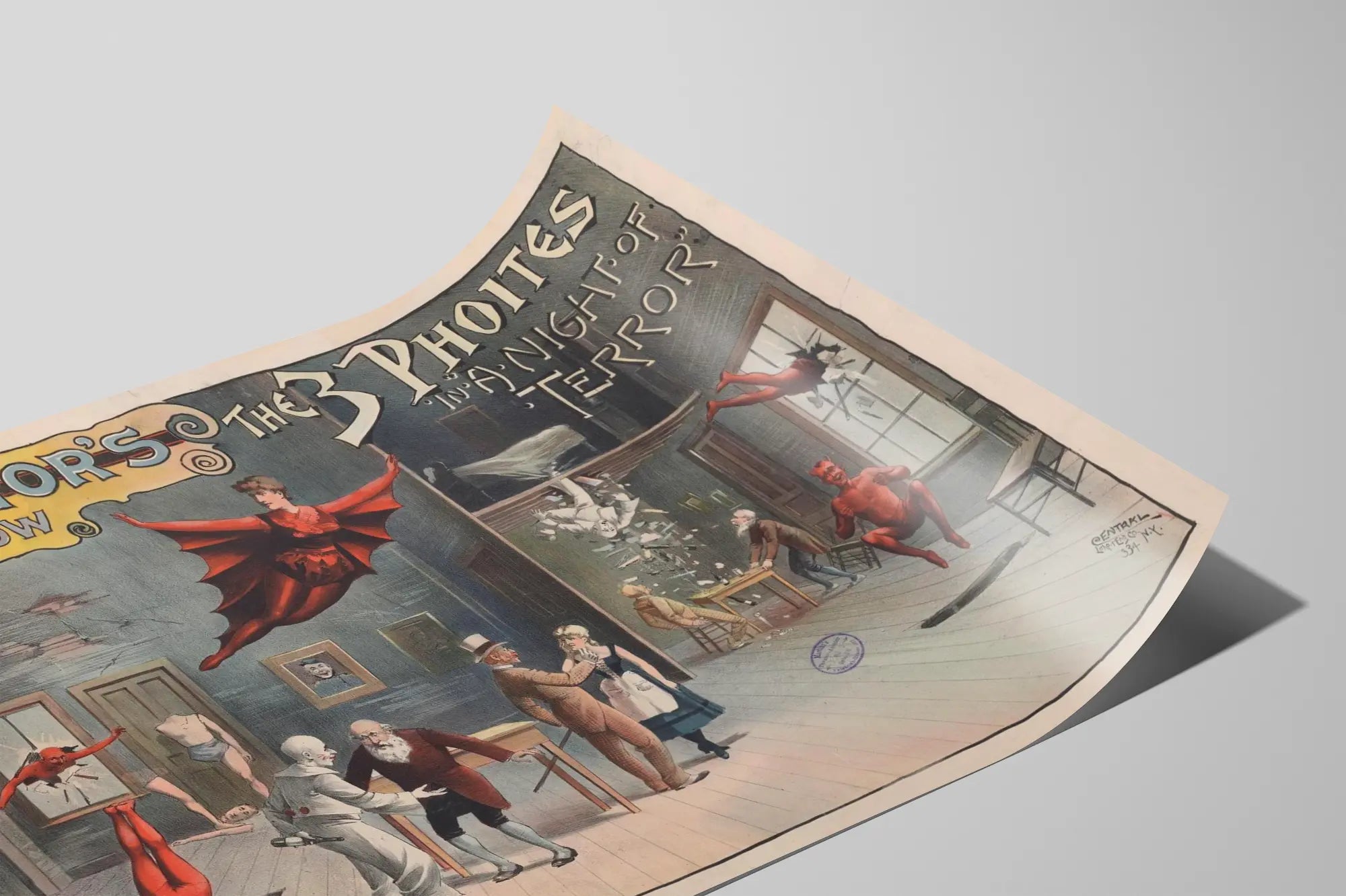 Deze boeiende vintage poster toont "Tony Pastor's Great Show" en de voorstelling getiteld "The 3 Phoites in a Night of Terror". Met een surreële en theatrale opstelling roept deze wanddecoratie een mysterieuze en fantastische sfeer op, waarin menselijke figuren en roodkleurige wezens die duivelsachtig fantasierijk lijken, bewegen in een door de tijd verweerde interieurdecoratie. De affiche benadrukt een reeks verrassende visuele effecten, zoals hangende figuren in de lucht, uiteenlopende silhouetten, evenals gebroken elementen en spookachtige verschijningen. Dit oude reclamepaneel, met zijn artistieke stijl uit de 19e of vroege 20e eeuw, voert de kijker mee naar de wereld van het levende theater van toen, waar illusie en spanning samenkomen. Ideaal voor een originele en karaktervolle wanddecoratie, brengt deze affiche een retro en raadselachtige toets in uw interieur, studio of entertainmentruimte. De keuze van kleuren en de aandacht voor detail versterken de dramatische en intrigerende uitstraling van deze illustratie, perfect voor liefhebbers van decors vol geschiedenis en mysterie. Deze vintage poster is een uitstekend element om een collectie oude affiches te verrijken of een muur tot leven te brengen onder het teken van theater, voorstelling en verbeelding.