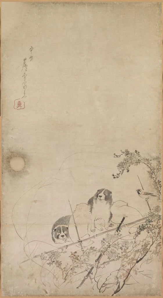 Kunstdruk | Puppies, sparrows en chrysanten - Nagasawa Rosetsu
