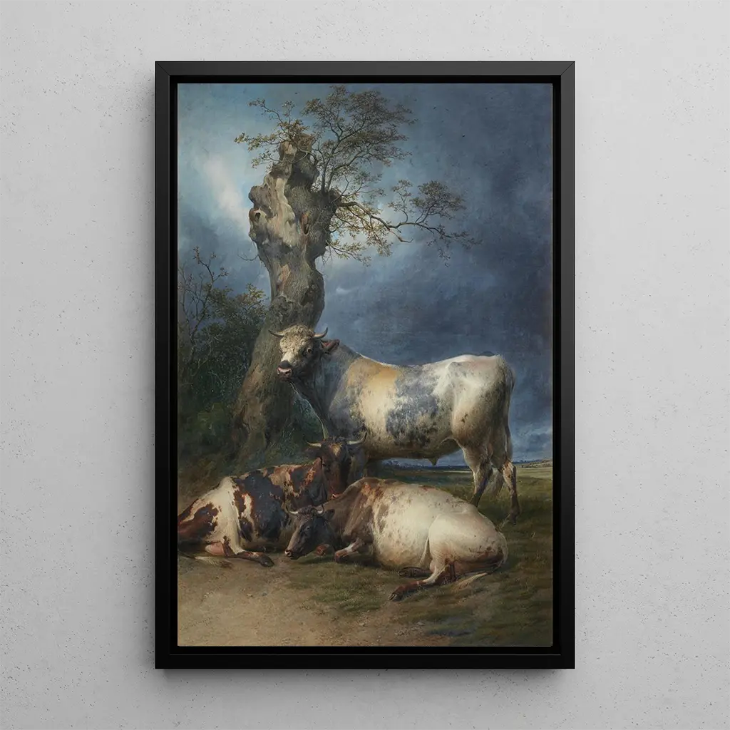 De kunstdruk "Repos" van Thomas Sidney Cooper vangt een moment van rust en kalmte. Dit doek beeldt een landelijk landschap uit waar dieren vredig rusten, omringd door weelderige natuur. De nuances van groen en blauw, gecombineerd met gouden lichtaccenten, creëren een rustgevende en contemplatieve sfeer. Cooper's techniek, die realisme en verfijning combineert, laat de zachtheid van het moment voelen en nodigt de kijker uit tot ontspanning en ontsnapping. Elk detail, van grassprieten tot delicate schaduwen, draagt bij aan de harmonie van de scène.