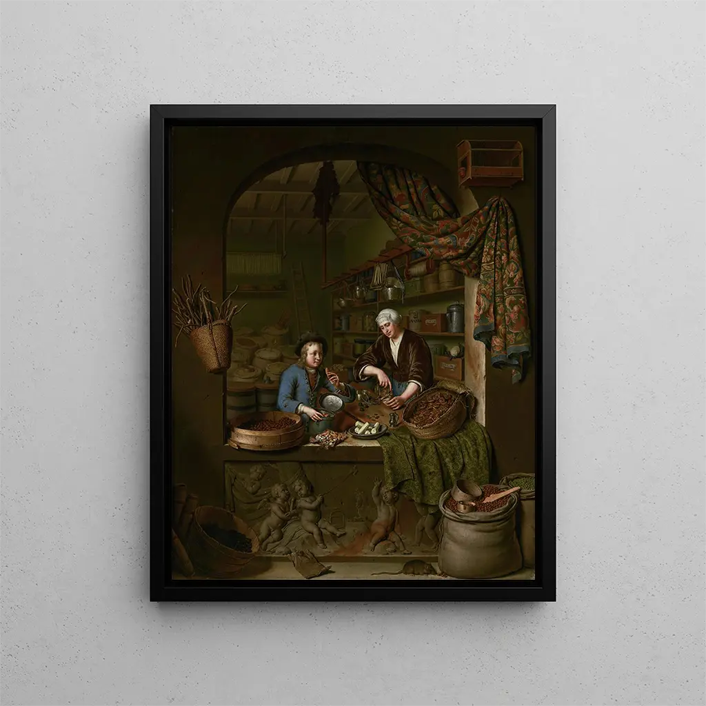 De kunstdruk van Een kruidenierswinkel van Willem van Mieris is ideaal om een vleugje klassieke verfijning aan uw inrichting toe te voegen. Opgehangen in een keuken, eetkamer of woonkamer, benadrukt het de gezelligheid, overvloed en zintuiglijk genot. Liefhebbers van Hollandse schilderkunst zullen de elegantie van genre-scènes herkennen, terwijl geschiedenisliefhebbers zijn unieke getuigenis van het dagelijks leven in de 17e eeuw zullen waarderen.