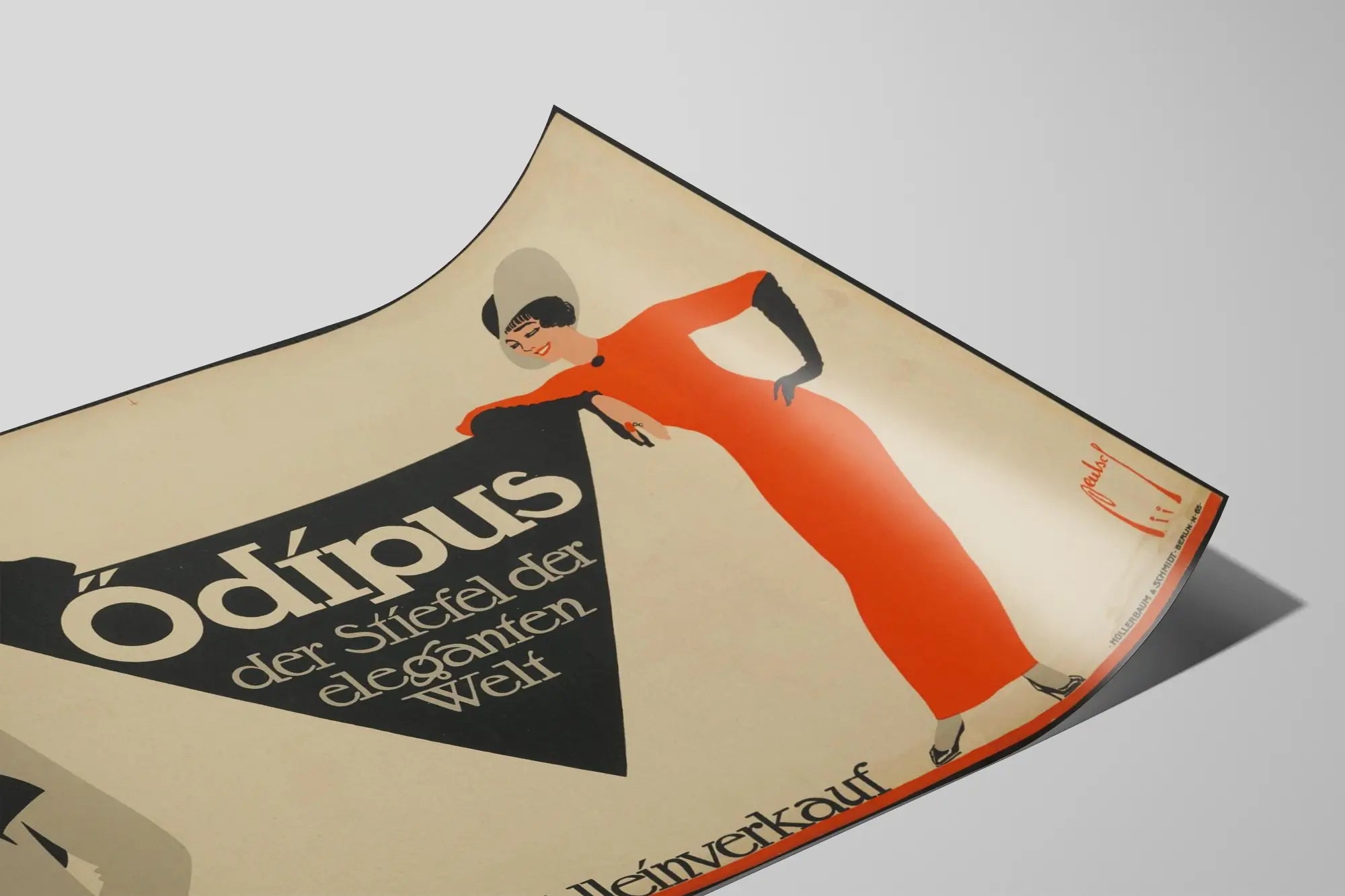 Deze vintage poster getiteld "Oedipus" toont een elegant stel afgebeeld in een retro grafische stijl, typerend voor de art deco. De personages zijn gekleed met grote verfijning: de man draagt een zwart pak met witte handschoenen en een bolhoed, terwijl de vrouw een lange, felrode jurk draagt, accessorized met zwarte handschoenen en een brede hoed, wat een zekere verfijning benadrukt. De gestileerde silhouetten omlijsten een zwart driehoekje in het midden van de poster, waarop de Duitse tekst "Ódípus der Stiefel der eleganten Welt" staat, wat een krachtig visueel contrast toevoegt en de aandacht onmiddellijk op de hoofdboodschap vestigt.