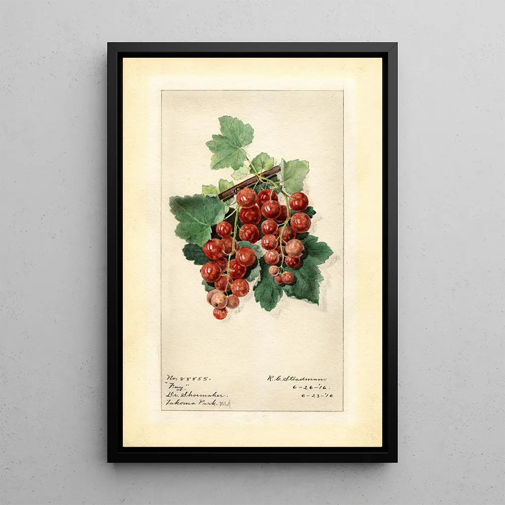 De kunstdruk Ribes Fay van Royal Charles Steadman roept een levendige wereld op waarin de natuur zich uitdrukt met een zeldzame intensiteit. De heldere kleuren, variërend van weelderige groenen tot diepe roodtinten, mengen harmonieus om een sfeer te creëren die zowel vrolijk als rustgevend is. De techniek van Steadman, die aquarel en olieverf combineert, geeft een lichte uitstraling aan het geheel, alsof de elementen van de compositie in de lucht drijven. Elk detail, van delicate bladeren tot sappige vruchten, wordt met precisie weergegeven die de kijker uitnodigt om onder te dompelen in dit betoverende schilderij.