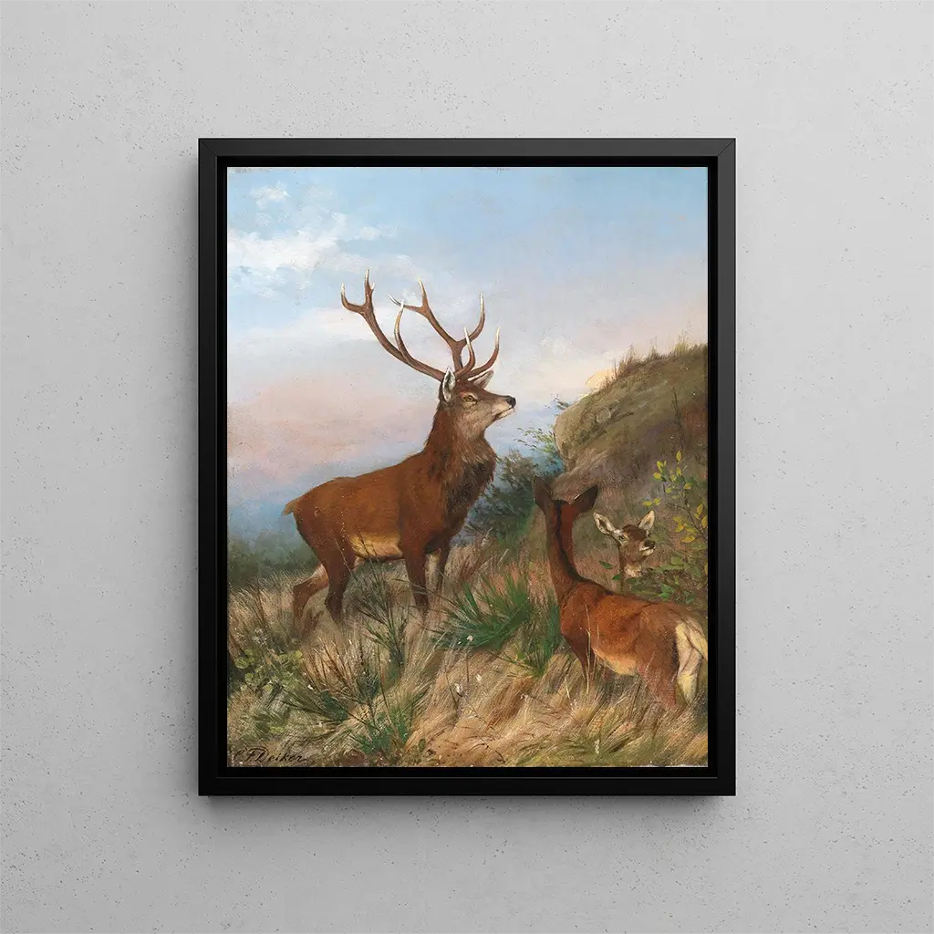In de wereld van kunst slagen sommige werken erin de tijd te overstijgen en de essentie van de natuur vast te leggen. "Kunstdruk hert rood bij schemering - Carl Friedrich Deiker" is een van die iconische stukken die uitnodigt tot diepe contemplatie. Dit schilderij, dat de wilde schoonheid van Europese landschappen oproept, dompelt ons onder in een sfeer die zowel sereen als mysterieus is. De scène toont een majestueus hert, symbool van de fauna, trots staand aan de rand van een open plek, terwijl de schemering de hemel kleurt met warme, gouden tinten. Dit werk beperkt zich niet tot het weergeven van een bevroren moment; het vertelt een verhaal, dat van een fragiele harmonie tussen mens en natuur.