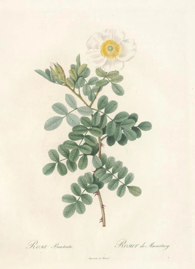 Pierre Joseph Redouté, bijgenaamd de "Raphaël der bloemen", is een iconische figuur in de botanische schilderkunst van de 18e eeuw. Geboren in 1759 in België, vestigt hij zich in Parijs waar hij de officiële bloemenschilder van het hof wordt. Geïnspireerd door neoclassicistische en romantische stromingen, specialiseert Redouté zich in de weergave van planten en bloemen met wetenschappelijke precisie. Zijn werken, waaronder Rosa Bracteata, getuigen van zijn uitzonderlijk talent en oog voor detail. Hij wist kunst en wetenschap te combineren, en droeg bij aan de popularisering van botanische studies in zijn tijd, terwijl hij een blijvende erfenis achterlaat in de wereld van de bloemkunst.