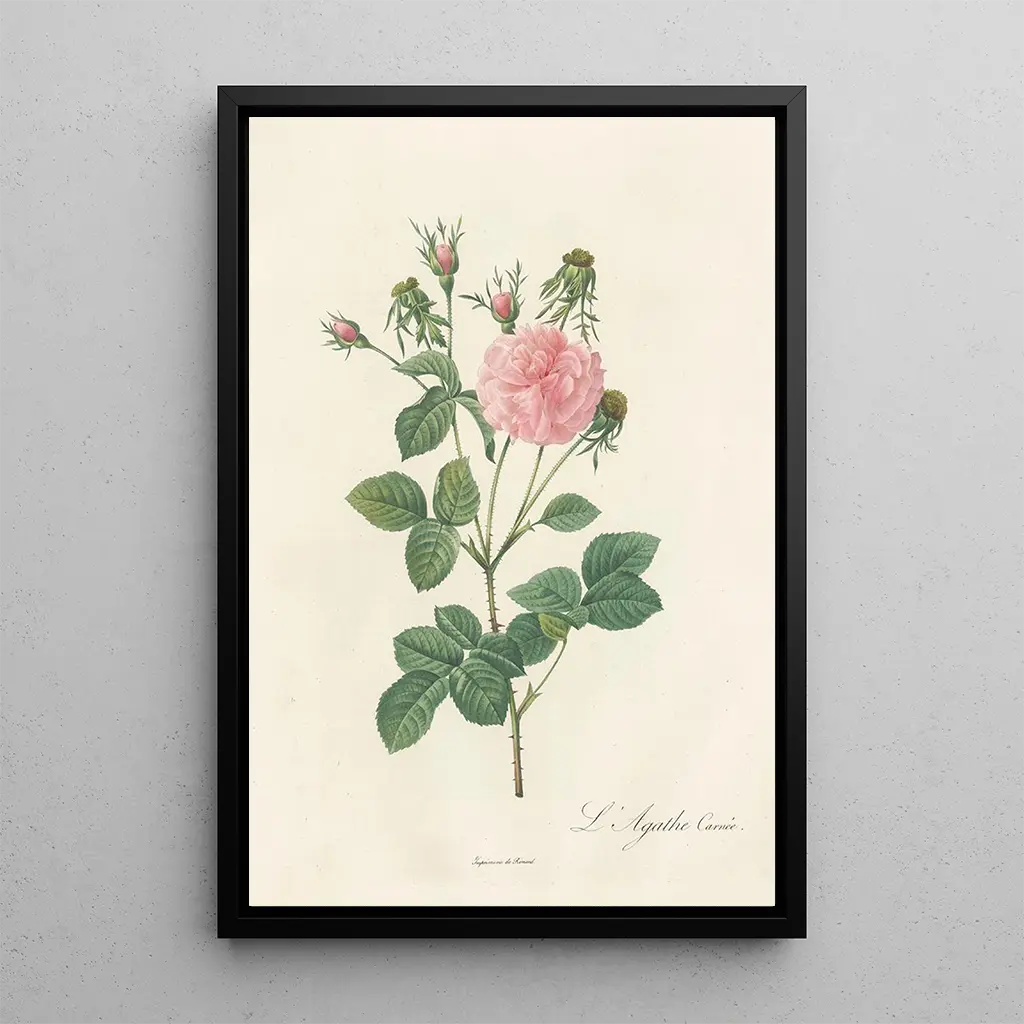 De kunstdruk van Rosa Gallica Agatha Incarnata dompelt ons onder in een wereld van zachtheid en natuurlijke schoonheid. Dit werk van Pierre Joseph Redouté, beroemd om zijn botanische illustraties, onderscheidt zich door zijn delicate pastelkleuren en minutieus uitgewerkte details. De bloemblaadjes van de roos, in een zachte roze tint, lijken bijna tastbaar, terwijl de nuances van groen in de bladeren een rustgevende harmonie brengen. De aquareltechniek, beheerst door Redouté, geeft dit doek een lichte en luchtige sfeer, die de kijker uitnodigt om zich te verwonderen over de pracht van de natuur.