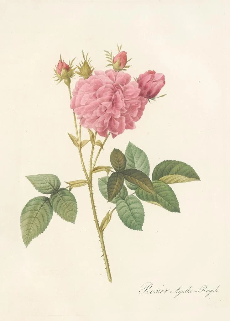 De kunstdruk van Rosa Gallica Agatha Var Regalis, een fascinerend werk van Pierre Joseph Redouté, roept een ongeëvenaarde bloemrijke majesteit op. Met haar heldere roze bloemblaadjes staat deze roos trots rechtop, en belichaamt de schoonheid en nobelheid van de natuur. De aquareltechniek, vakkundig toegepast door Redouté, maakt het mogelijk om de textuur en de helderheid van de bloemen met opmerkelijke precisie weer te geven. De sfeer die uit dit werk straalt, is zowel romantisch als rustgevend, en nodigt de kijker uit om zich te verwonderen over de pracht van de rozen. Elke kleurtoon wordt zorgvuldig gekozen, wat getuigt van het uitzonderlijke talent van de kunstenaar.