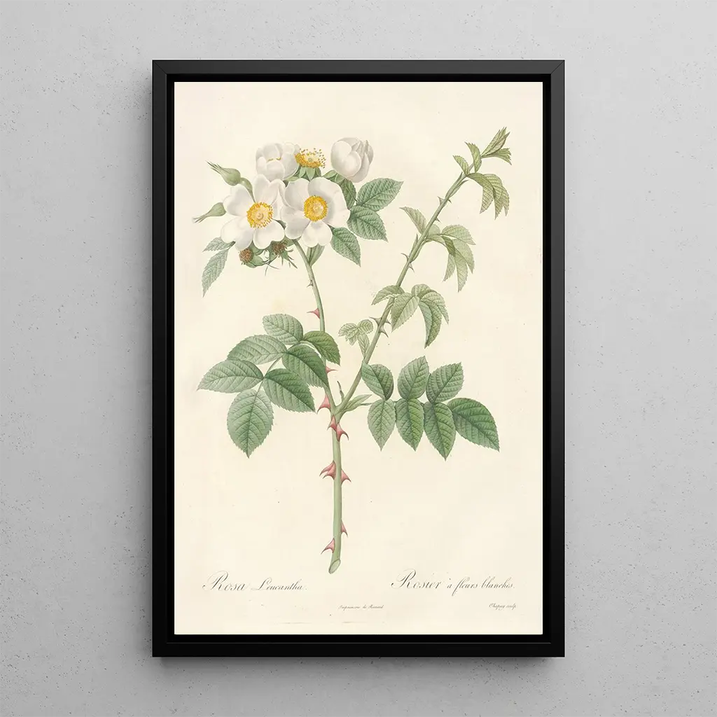 Pierre Joseph Redouté, actief in de 18e eeuw, wordt erkend als een van de grootste bloemillustratoren van zijn tijd. Zijn werk, gekenmerkt door een neoclassicistische stijl, combineert wetenschappelijke precisie met artistiek gevoel. Geïnspireerd door koninklijke tuinen en botanische ontdekkingen uit zijn tijd, wist Redouté de essentie van bloemen vast te leggen met zo’n finesse dat hij de officiële schilder werd van Marie-Antoinette. Rosa Leucantha, een van zijn vele werken, getuigt van zijn uitzonderlijk talent en zijn inzet om de schoonheid van de natuur met ongeëvenaarde precisie weer te geven.