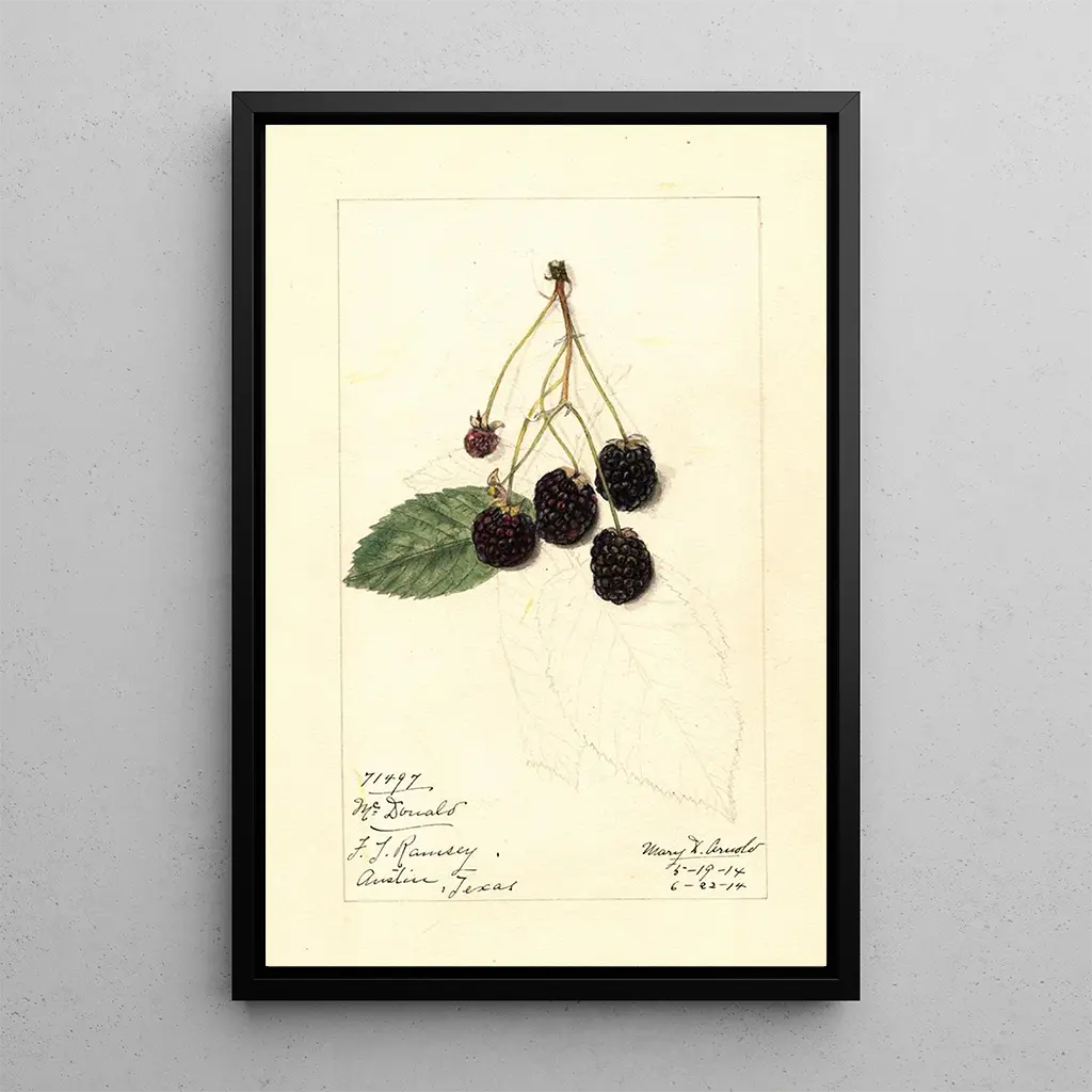 "Rubus McDonald" van Mary Daisy Arnold is een kunstdruk die de wilde schoonheid en de rijkdom van de natuur oproept. In dit doek beeldt de kunstenaar met finesse doornstruiken en bessen af, waardoor een levendige en dynamische compositie ontstaat. De heldere kleuren van rood, groen en violet verweven zich om dit tafereel tot leven te brengen, terwijl de delicate techniek van de kunstenaar de textuur van bladeren en vruchten laat voelen. De sfeer die van dit werk afstraalt, is zowel vrolijk als rustgevend, en nodigt de kijker uit om zich onder te dompelen in een wereld waar de natuur heerst.