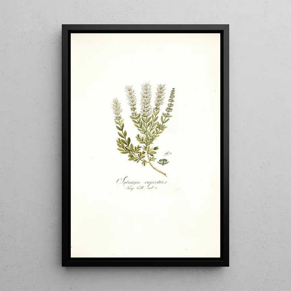 De kunstdruk van Satureja rupestris brengt ons in een weelderige tuin, waar de aromatische kruiden hun volle pracht tonen. Dit werk van Nikolaus Joseph Freiherr von Jacquin wordt gekenmerkt door een levendige en gedetailleerde voorstelling van de plant, met de nadruk op haar delicate bladeren en discrete bloemen. De kleuren, variërend van diepgroen tot subtiel paars, creëren een visueel evenwicht dat de rijkdom van smaken en geuren oproept. De aquareltechniek, beheerst door Jacquin, geeft dit doek een lichtheid en frisheid die uitnodigen tot zintuiglijke verkenning.