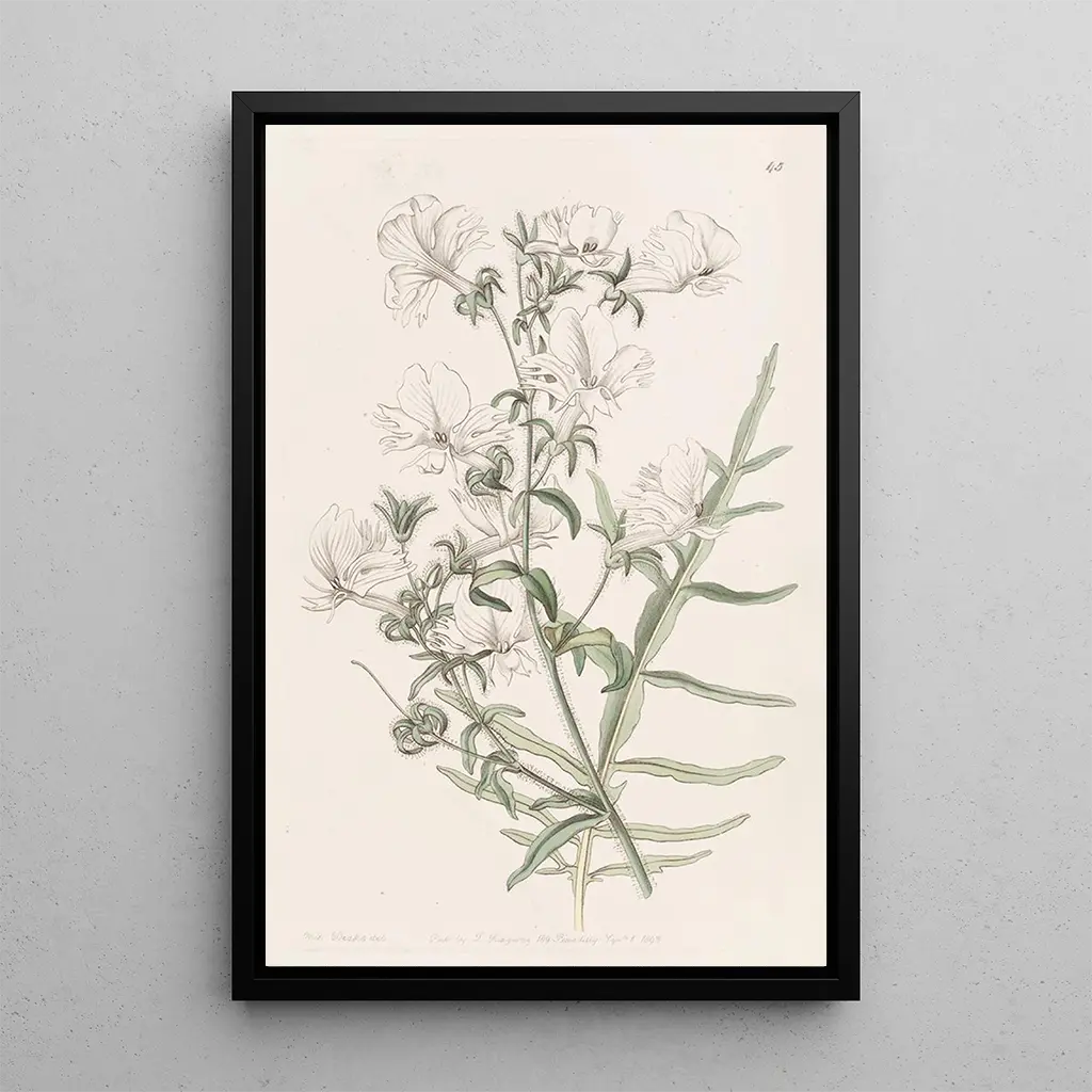 Le tableau Schizanthus blanc, réalisé par Sydenham Edwards, nous plonge dans un univers de douceur et de légèreté. Les pétales délicats de cette fleur, aux nuances blanches et légèrement teintées de vert, s'épanouissent avec grâce, évoquant une danse subtile au gré du vent. La technique de l’aquarelle, utilisée avec maestria, confère à l'œuvre une atmosphère aérienne et éthérée, où chaque détail est soigneusement mis en valeur. Les jeux de lumière et d’ombre créent une profondeur captivante, invitant le spectateur à s'approcher et à admirer la beauté fragile de cette plante.