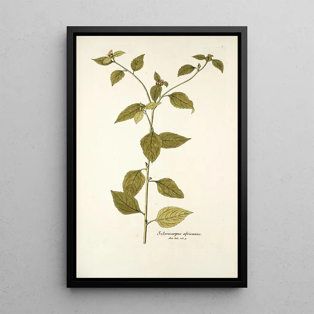 De kunstdruk van Sclerocarpus africanus, vervaardigd door Nikolaus Joseph Freiherr von Jacquin, brengt ons naar het hart van de Afrikaanse biodiversiteit. Dit werk onderscheidt zich door zijn aardetinten en organische vormen, die de rijkdom van de flora van het continent oproepen. De aquareltechniek, met haar subtiele gradaties, geeft diepte aan de voorstelling en eert de ruwe schoonheid van de natuur. Elk detail wordt zorgvuldig waargenomen, waardoor een meeslepende sfeer ontstaat die uitnodigt tot ontsnapping.