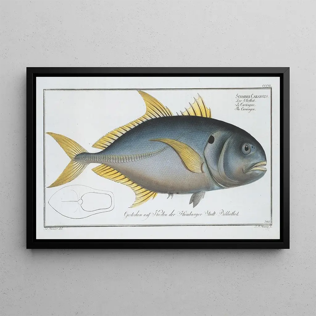 De kunstdruk Scomber carangus, de karang, van Marcus Elieser Bloch, onthult een fascinerende voorstelling van deze iconische vis. De nuances van blauw en zilver, gecombineerd met vleugjes geel, roepen het sprankelende licht van de oceaan op. De gravuretechniek, zorgvuldig uitgevoerd, maakt het mogelijk om de delicate details van de schubben en vinnen vast te leggen, terwijl het een sfeer van rust en sereniteit uitstraalt. Het kunstwerk nodigt de kijker uit om onder te dompelen in de onderwaterwereld, de diepten te verkennen en de schoonheid van de levende wezens te waarderen.