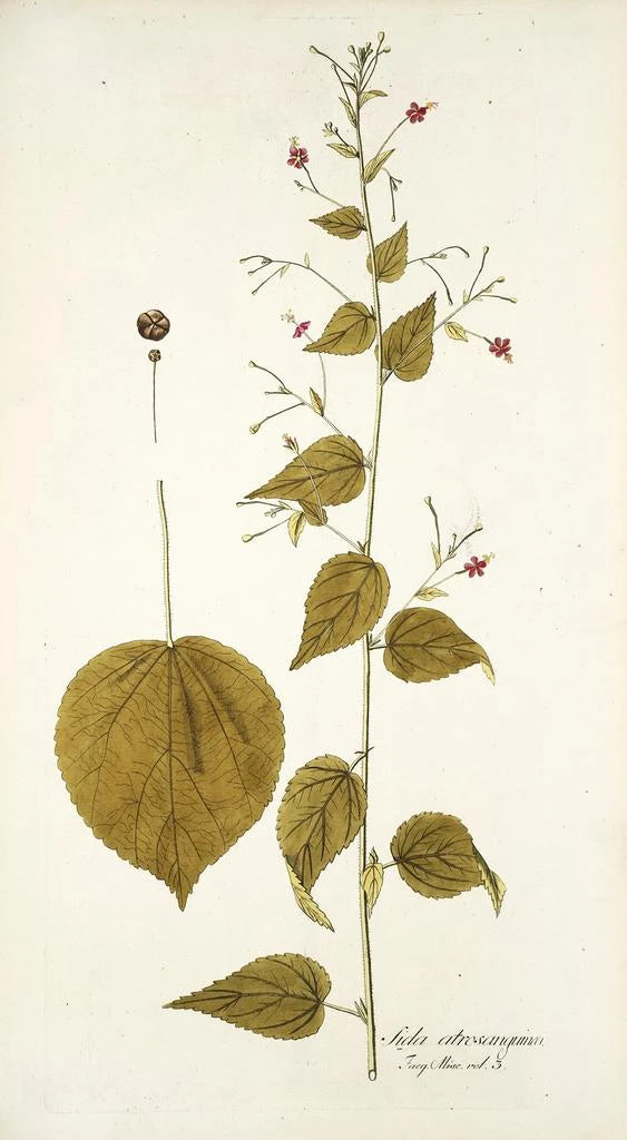 De kunstdruk van Sida atrosanguinea dompelt ons onder in een fascinerend botanisch universum, waar de levendige tinten rood en groen zich delicieus verweven. Dit werk, uitgevoerd met minutieuze precisie, benadrukt de details van de bladeren en bloemen, en vangt de essentie van de plant zelf. De aquareltechniek, toegepast door de kunstenaar, geeft een lichte uitstraling aan het geheel en creëert een sfeer die zowel sereen als levendig is. Elke penseelstreek lijkt een verhaal te vertellen, en nodigt de kijker uit om de schoonheid van de natuur te verkennen door een artistiek prisma.
