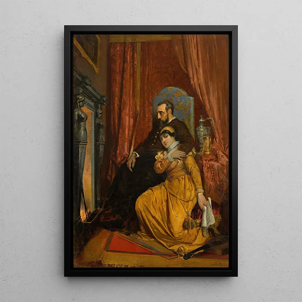 La toile "Sigismond Auguste et Barbara Giza" de Tadeusz Popiel capture un instant précieux d'une romance historique, où les personnages sont représentés avec une intensité émotionnelle saisissante. Les couleurs vives et les détails raffinés témoignent de l'habileté de l'artiste à rendre l'atmosphère vibrante et vivante. La composition, centrée sur les deux protagonistes, évoque une connexion profonde entre eux, tandis que le fond, subtilement flou, met en valeur leur amour. Cette œuvre, à la fois narrative et picturale, transporte le spectateur dans un monde où l'amour transcende le temps.