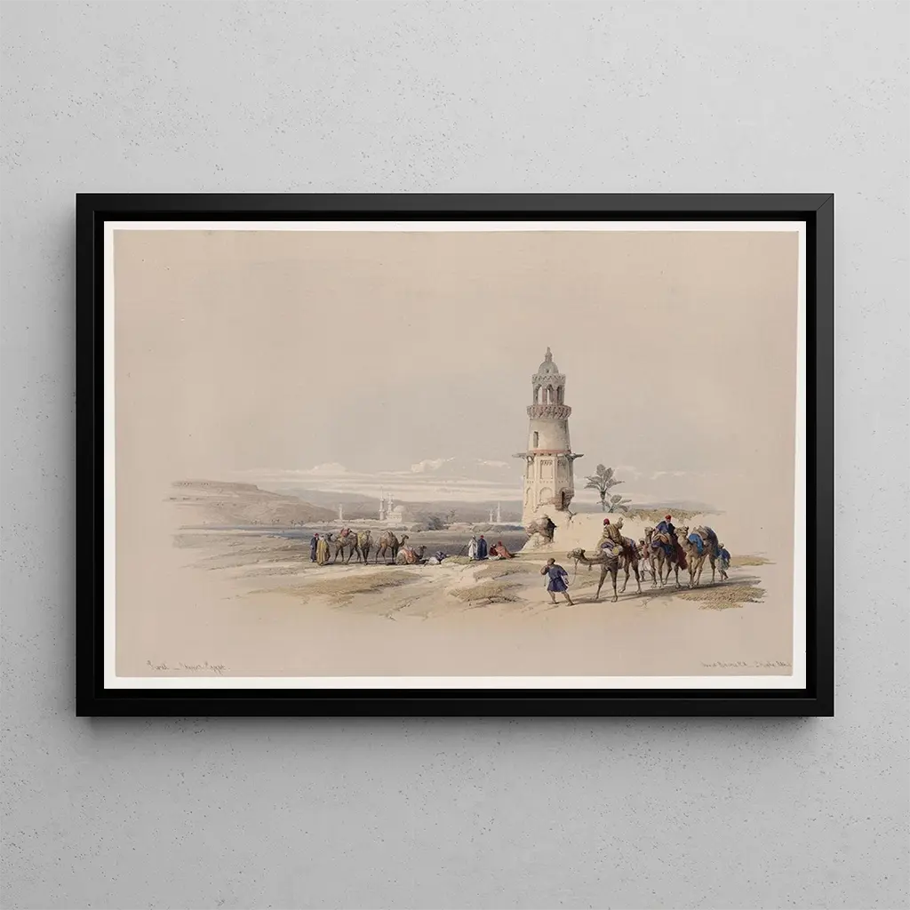 "Siout Asyut Haute-Égypte" is een iconisch kunstwerk van David Roberts dat ons meeneemt naar het hart van de Egyptische landschappen. Met een palet van warme kleuren, variërend van okers tot diepe blauwen, vangt Roberts de majesteit van de monumenten en woestijnlandschappen. De fijne aquareltechniek maakt het mogelijk om het stralende licht van de Egyptische zon weer te geven, waardoor een sfeer ontstaat die zowel mystiek als realistisch is. Elk detail, van de silhouetten van de piramides tot de nuances van de duinen, roept een oude wereld op, rijk aan geschiedenis en cultuur, en nodigt de kijker uit om de wonderen van Egypte te verkennen.