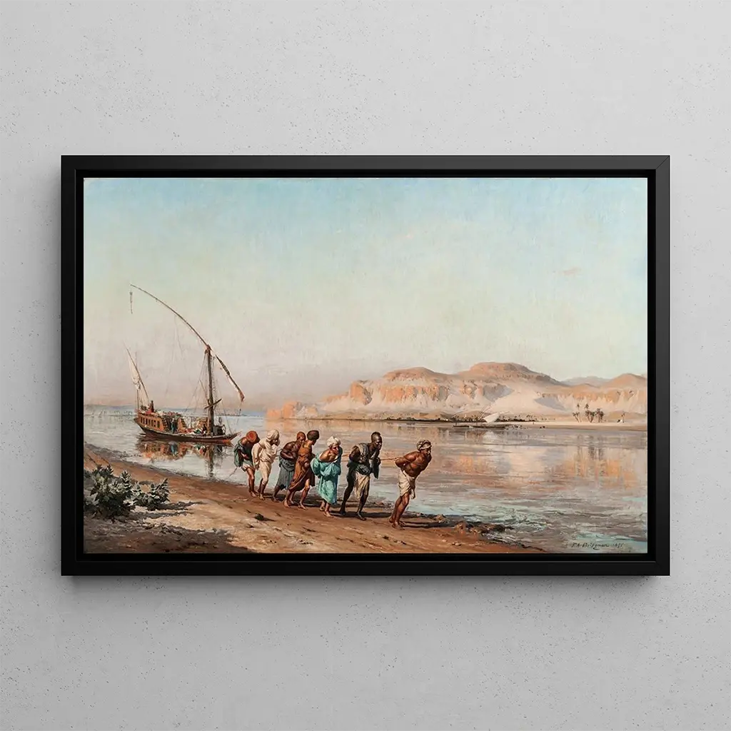 In "Remorquage sur le Nil" dompelt Frederick Arthur Bridgman ons onder in een Egyptisch landschap waar het gouden licht van de zon weerspiegelt op de rustige wateren van de rivier. De compositie is zorgvuldig georkestreerd, met warme tinten van zand en aarde die worden gecombineerd met diepe blauwtinten. De witte zeilen van de boten contrasteren met de rijkdom van de omliggende kleuren, waardoor een rustige en contemplatieve sfeer ontstaat. De minutieuze details van de personages en de vaartuigen getuigen van de technische meesterschap van de kunstenaar, en nodigen de kijker uit om zich onder te dompelen in deze scène van het dagelijks leven op de Nijl.