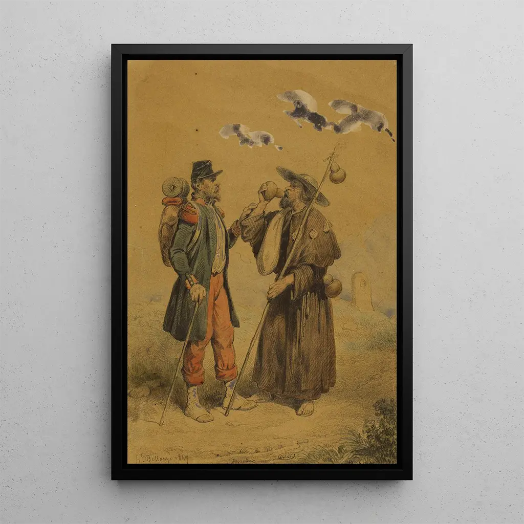 In het werk "Soldaat donnant à boire à un pèlerin" van Hippolyte Bellangé ontvouwt zich voor onze ogen een moment van tederheid en menselijkheid. De scène, rijk aan details, benadrukt een soldaat in uniform die water aanbiedt aan een vermoeide pelgrim. De warme, aardse kleuren roepen een sfeer van warmte en solidariteit op, terwijl Bellangé's techniek, die realisme en romantiek combineert, deze emotionele interactie tot leven brengt. Elk element van de compositie, van uitdrukkingen tot houdingen, draagt bij aan het creëren van een krachtige visuele vertelling die het hart raakt.