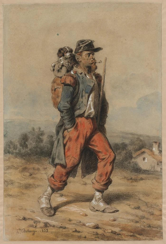 Hippolyte Bellangé, actief in de 19e eeuw, staat bekend om zijn kunstwerken die het militaire leven met grote precisie illustreren. Geïnspireerd door het romantisme, wist hij momenten van moed en heldendom vast te leggen, terwijl hij de menselijke dimensie van zijn onderwerpen benadrukte. Zijn schilderijen, vaak geïnspireerd door historische gebeurtenissen, getuigen van een tijd waarin oorlog alomtegenwoordig was. Bellangé wist naam te maken dankzij zijn vermogen om veldslagen te vereeuwigen, maar ook tedere momenten, zoals deze, waarin de relatie tussen mens en dier in de schijnwerpers staat.