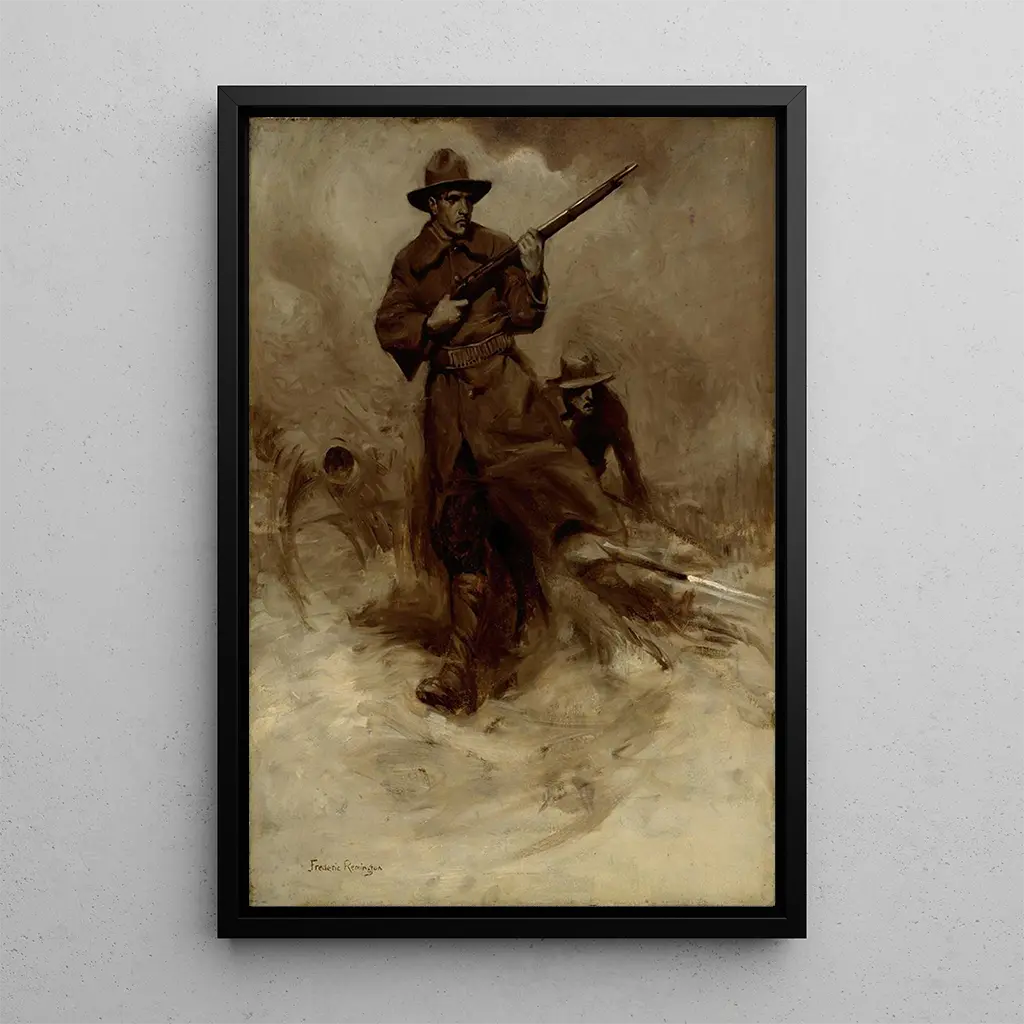 De kunstdruk van Soldaten van de Spaans-Amerikaanse oorlog in actie beeldt een dynamische en emotioneel geladen scène uit, waarin soldaten dapper vechten. De donkere kleuren en opvallende contrasten versterken de spanning van het moment, terwijl de details van de uniformen en de uitdrukkingen van de personages een dramatische diepte aan het werk toevoegen. De schildertechniek die Gilbert Gaul gebruikt, met zijn energieke penseelstreken, geeft een gevoel van beweging en urgentie, waardoor de kijker wordt ondergedompeld in de militaire actie.