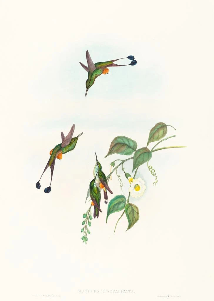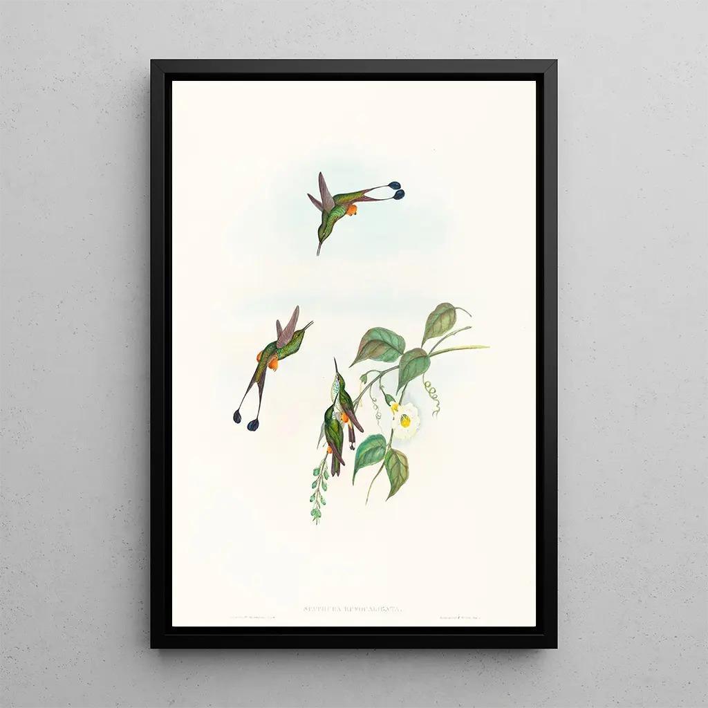 John Gould, actief in de 19e eeuw, is een iconische figuur in de ornithologie en de naturalistische kunst. Zijn carrière, gekenmerkt door reizen over de hele wereld, stelde hem in staat om vaak onbekende vogelsoorten te ontdekken en te vertegenwoordigen. Geïnspireerd door de artistieke stromingen van zijn tijd, wist Gould wetenschappelijke precisie te combineren met artistieke gevoeligheid, waardoor zijn werken onmiskenbare referenties werden. Zijn illustraties, zoals die van Spathura à pattes rousses, getuigen van zijn inzet om de biodiversiteit te eren en het publiek te onderwijzen over de schoonheid van het dierenrijk.