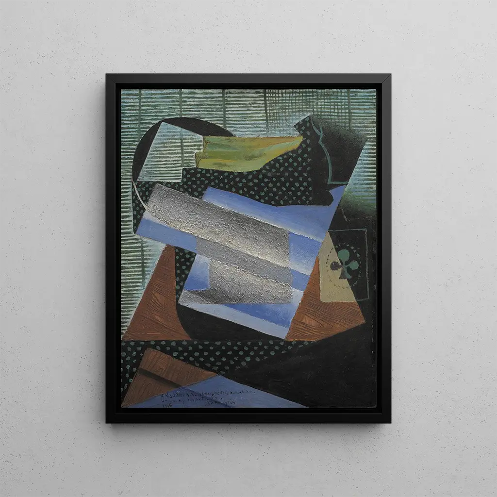 De kunstdruk van de natuurstudie van Juan Gris dompelt ons onder in een wereld waar alledaagse voorwerpen transformeren in een visuele symfonie. De geometrische vormen verweven zich met levendige kleuren, waardoor een sfeer ontstaat die zowel dynamisch als rustgevend is. Gris, meester van het kubisme, gebruikt collage- en overlaytechnieken om leven te blazen in objecten zoals fruit, flessen en boeken. Elk element is zorgvuldig gerangschikt en nodigt de kijker uit om de relaties tussen de voorwerpen en hun omgeving te verkennen. Het licht speelt een essentiële rol door de volumes en texturen te accentueren, terwijl het bijna poëtische dimensie aan deze compositie toevoegt.