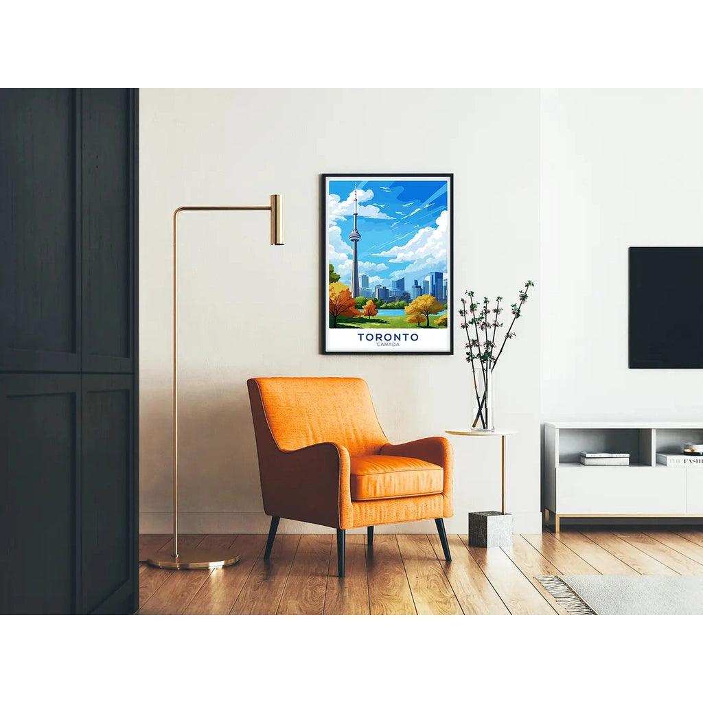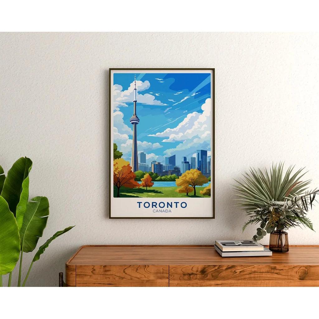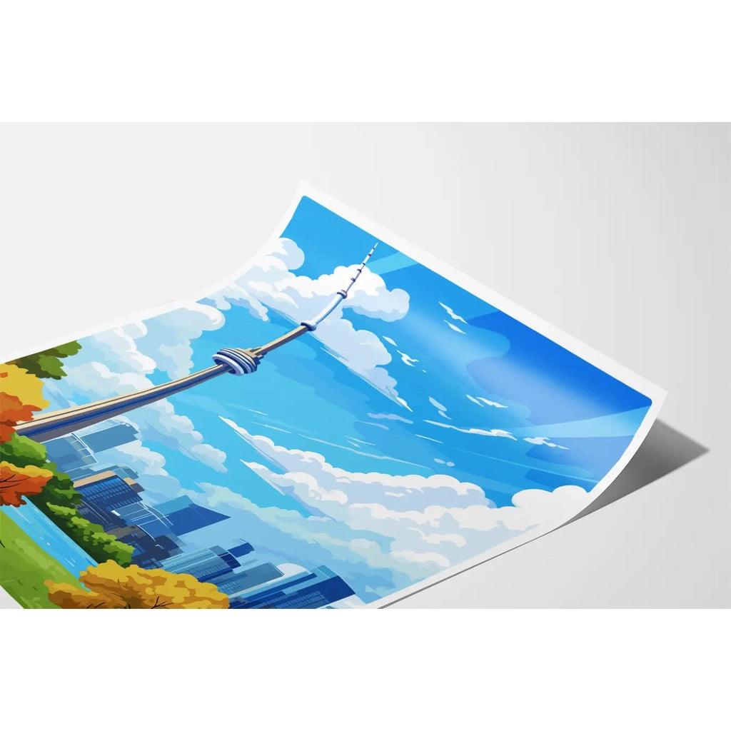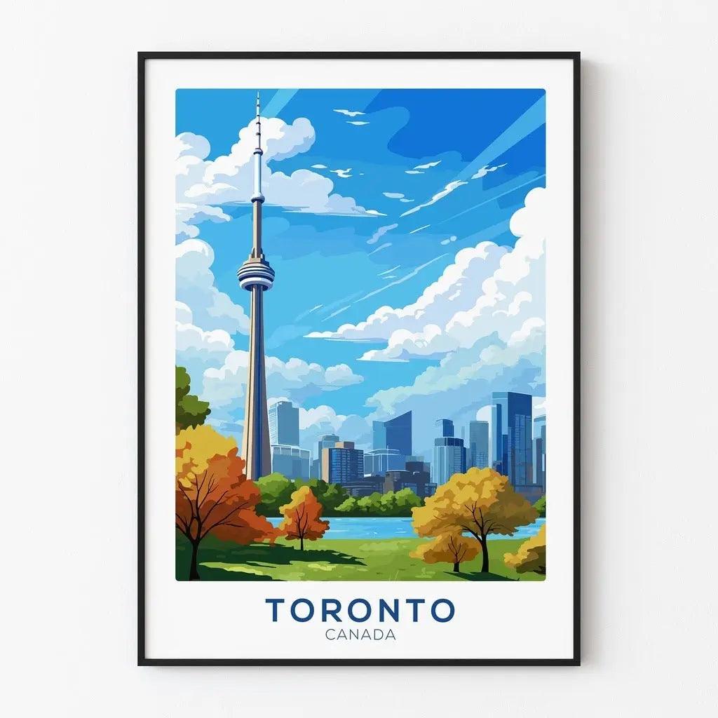 Duik in de stedelijke pracht met onze kunstdruk van de dynamische stad Toronto. Deze levendige poster vangt de essentie van de Canadese metropool met de beroemde CN-toren die naar een azuurblauwe lucht reikt. De herfsttinten van de bomen op de voorgrond voegen een vleugje warmte toe, terwijl de glazen en stalen horizon de innovatieve geest van Toronto weerspiegelt.