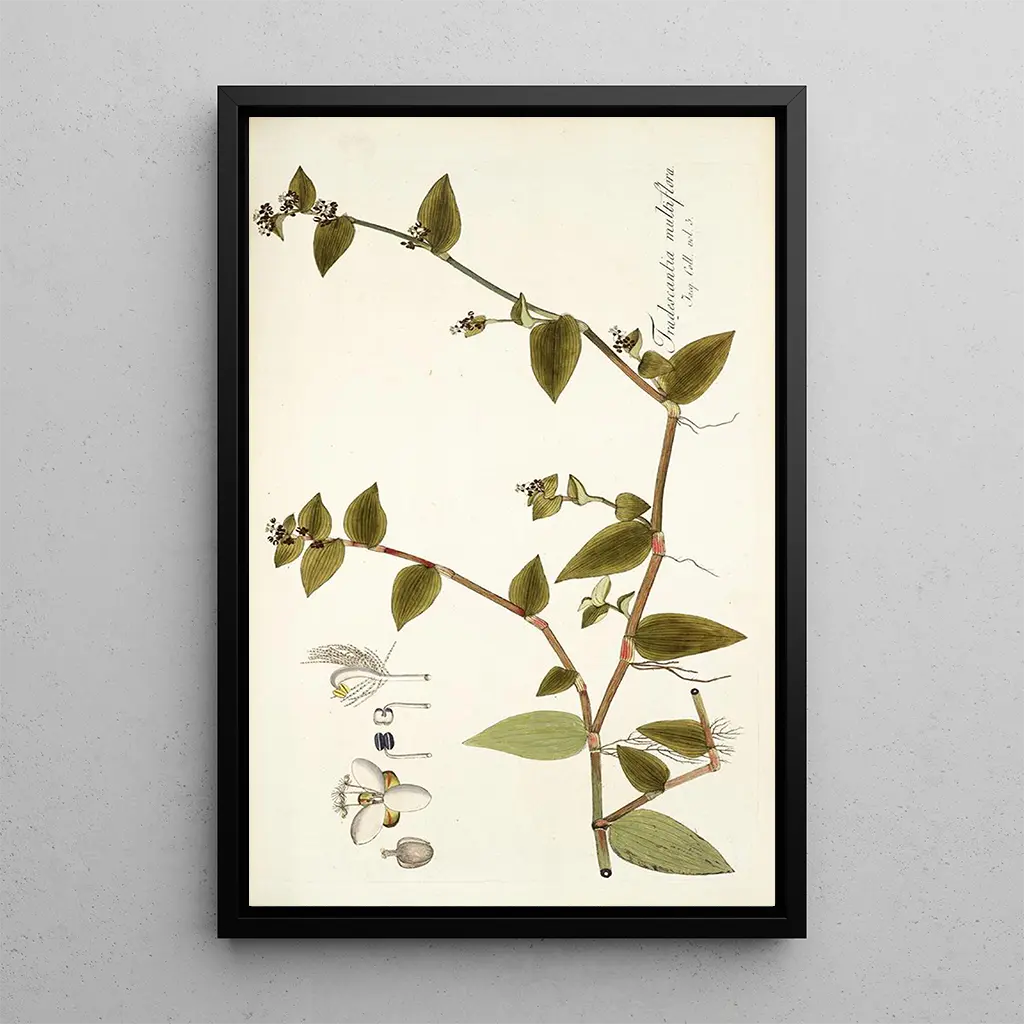 De kunstdruk van Tradescantia multiflora is een ware viering van de bloemrijke biodiversiteit. Met zijn levendige tinten groen, roze en paars roept dit schilderij een gevoel van vreugde en vitaliteit op. De kunstenaar heeft de delicatesse van de bladeren en de rijkdom van de texturen weten vast te leggen, waardoor een bijna tastbare sfeer ontstaat. Elk detail is zorgvuldig weergegeven, waardoor de kijker wordt uitgenodigd om de subtiliteiten van deze fascinerende plant te verkennen. De dynamische en evenwichtige compositie van het werk roept beweging op, alsof de bloemen dansen onder een lichte bries, en brengt een vleugje natuur in uw ruimte.