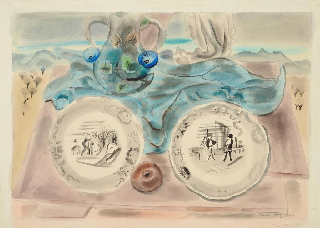 Frances Hodgkins biedt ons met Deux Assiettes een levendig kunstwerk dat de schoonheid van alledaagse voorwerpen viert. De compositie, gericht op de borden, wordt versterkt door stralende bloemmotieven die zich gracieus verweven. De kleuren, variërend van diepe roodtinten tot heldere groenen, creëren een boeiende visuele harmonie. De aquareltechniek, beheerst door Hodgkins, maakt het mogelijk te spelen met transparantie en licht, waardoor elk detail tot leven komt. Dit doek, zowel eenvoudig als rijk, nodigt ons uit om de schoonheid van gewone dingen te waarderen.