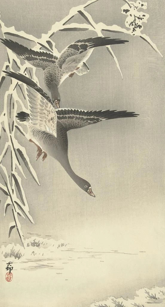 Kunstdruk | Twee eenden met witte voorhoofden in een besneeuwd landschap - Ohara Koson