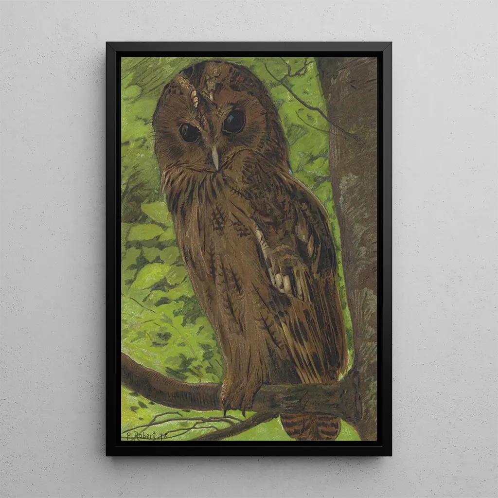 De kunstdruk van de Chouette hulotte van Léon Paul Robert vangt de essentie van de nachtelijke natuur. Met nuances van bruin en beige roept dit doek de zachtheid van schaduwen en de mystiek van bossen op. De minutieuze details van de veren, uitgevoerd met een verfijnde olieverftechniek, creëren een sfeer die zowel sereen als intrigerend is. Het vogel, majestueus op een tak, lijkt zijn omgeving met een fascinerende intensiteit te observeren en nodigt de kijker uit om onder te dompelen in een wereld waar de stilte van de nacht heerst.