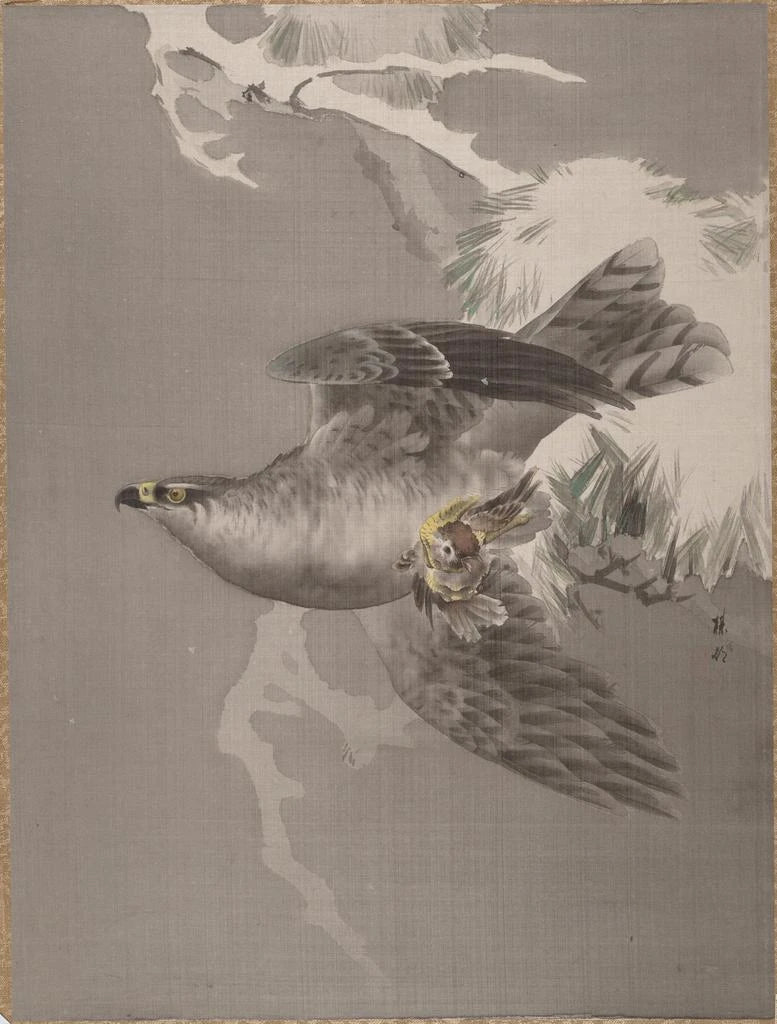 Valk die een klein vogeltje vasthoudt - Okada Baison