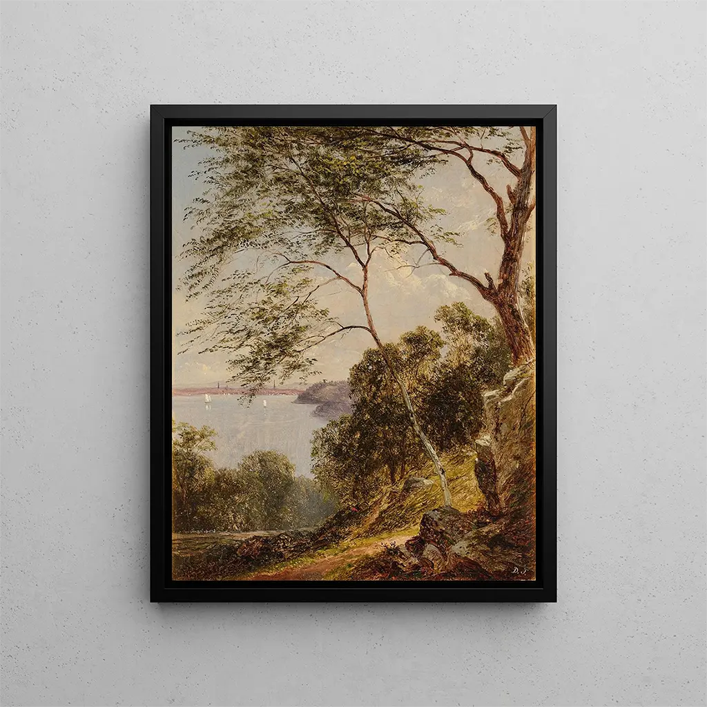 De stijl van David Johnson is diep geworteld in de beweging van de Hudson River School, die een romantische en realistische benadering van het landschap propageert. In "Sinds Union Hill Hoboken" gebruikt Johnson een subtiel gekleurde palet, waarin de weelderige groenen van de bomen samensmelten met de glinsterende reflecties van het water. De compositie van het kunstwerk is zowel evenwichtig als dynamisch, met natuurlijke elementen die lijken te dansen onder invloed van het licht. Dit schilderij beperkt zich niet tot het weergeven van een landschap; het roept een sfeer op, een emotie. Elke penseelstreek is een uitnodiging om de zachtheid van de wind, het gefluister van het water en de warmte van de zon op de huid te voelen. Het is dat vermogen om het eenvoudige visuele te overstijgen en de ziel te raken dat dit werk een onmiskenbare uniekheid verleent.