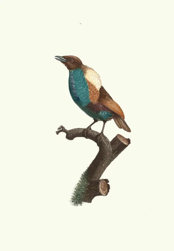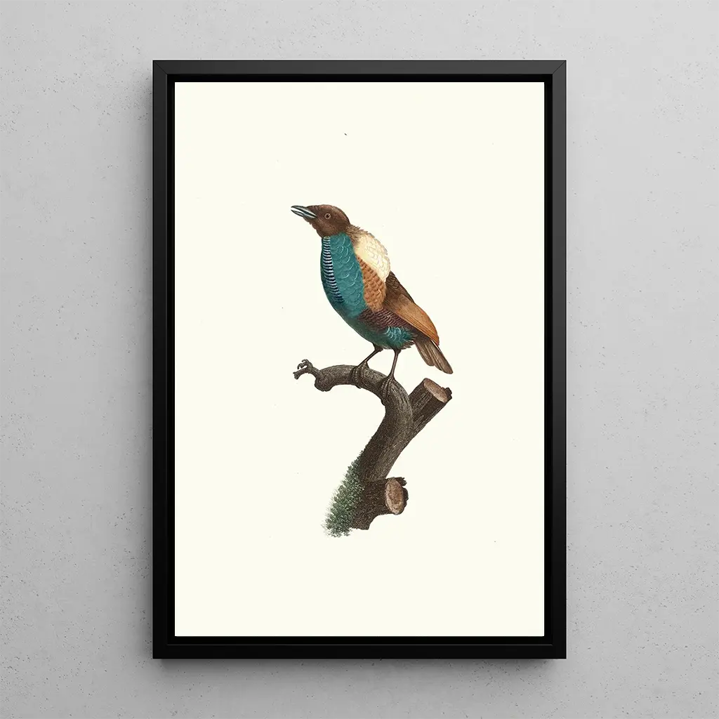De kunstdruk van de Variété du Magnifique van Jacques Barraband is een waar meesterwerk dat de majesteit van de vogels benadrukt. Dit werk, levendig in kleuren, toont een vogel met schitterende veren, met nuances van rood, blauw en goud die de blik vasthouden. De aquareltechniek, met grote finesse toegepast, brengt de textuur van de veren en de helderheid van de kleuren tot leven. De sfeer die uit dit doek straalt, is zowel dynamisch als harmonieus, en transporteert de kijker naar een universum waar natuurlijke schoonheid heerst.
