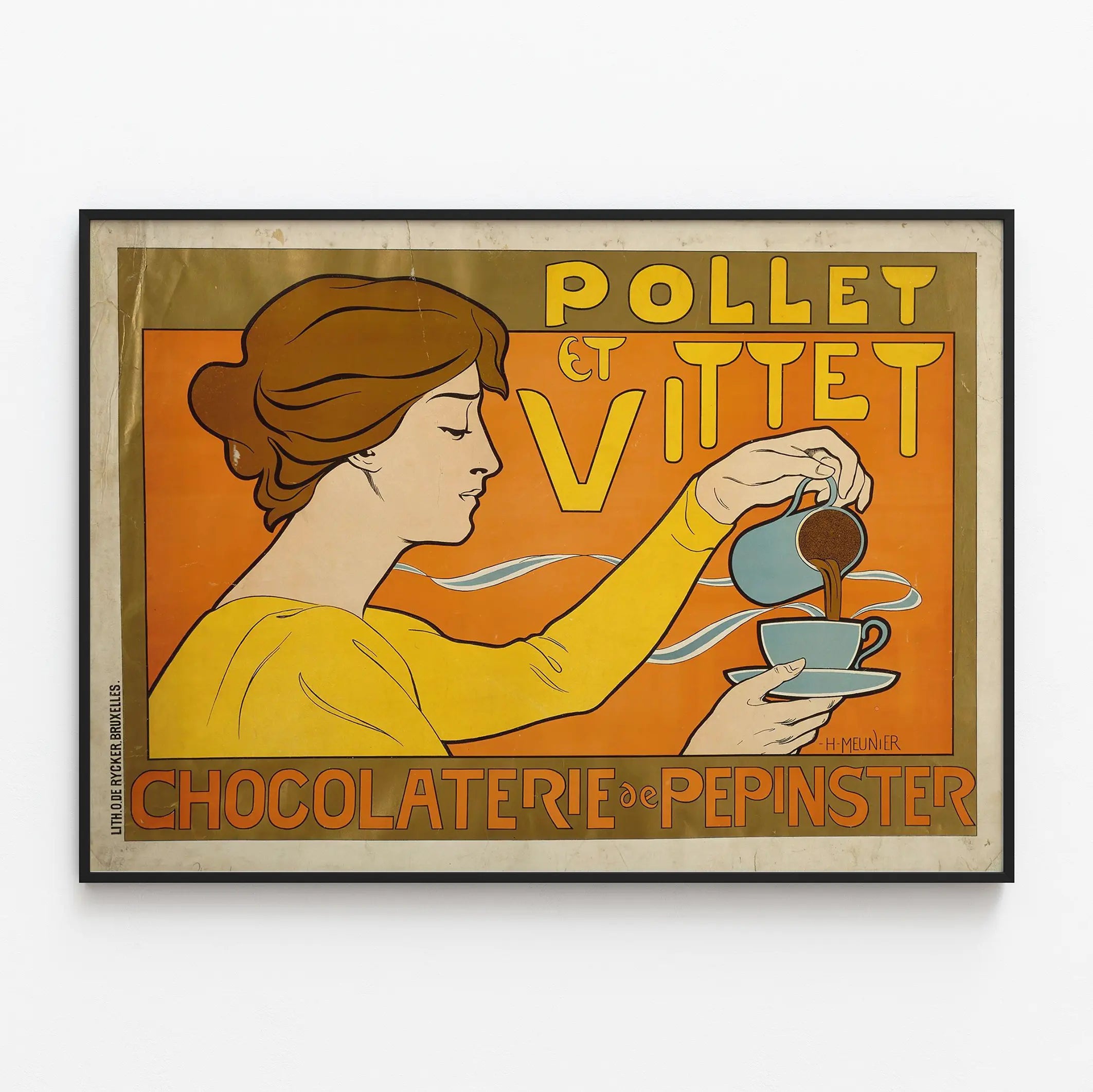 Ontdek dit vintage affiche van Pollet en Vittet, een ideale muurdecoratie voor liefhebbers van retrokunst en chocoladeachtige sfeer. Deze reclameposter toont een elegante vrouw met een delicate profiel, gekleed in een gele jurk, die een warme drank in een blauwe beker schenkt. Het geheel wordt benadrukt door warme kleuren, gedomineerd door oranje en geel, aangevuld met accenten van blauw en bruin, waardoor een harmonieuze en oogstrelende contrast ontstaat.
