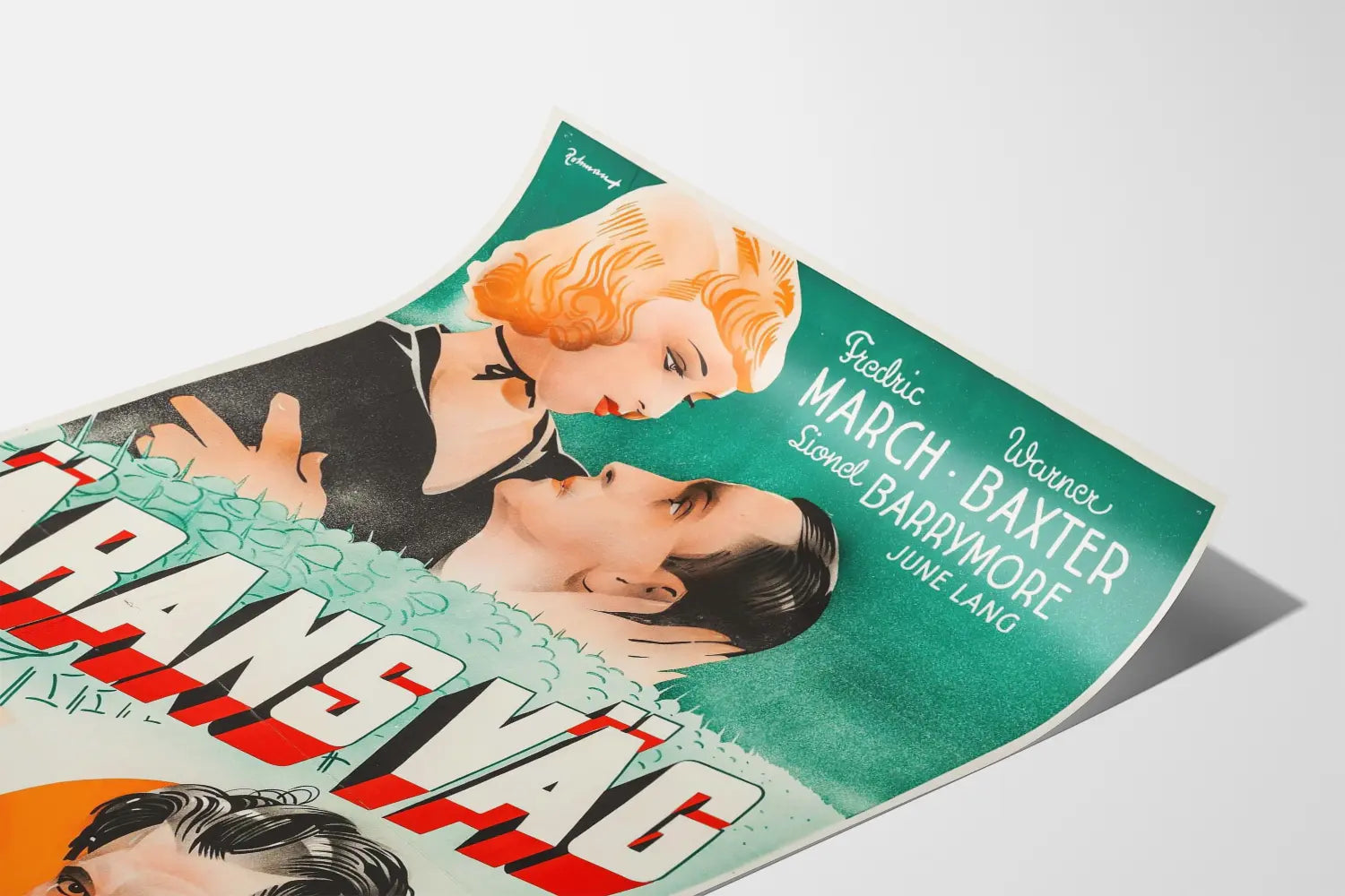 Deze vintage filmposter is een opvallend wanddecoratiestuk dat liefhebbers van retro design en klassieke grafische kunst zal boeien. Ze toont een kleurrijke en gestileerde illustratie met twee hoofdpersonen op de voorgrond: een blond vrouw en een man met een intense blik, in een stijl die typisch is voor affiches uit de jaren 1930 tot 1940. De namen van de acteurs Fredric March, Warner Baxter, Lionel Barrymore en June Lang zijn zichtbaar bovenaan de poster, wat de cast van de afgebeelde film benadrukt. Het kunstwerk bevat ook een achtergrond in een groen verloop, versierd met witte en rode grafische elementen, met een hoofd titel "Ärans Väg" in volumineuze en dynamische letters, die een krachtig visueel accent toevoegen aan het geheel.