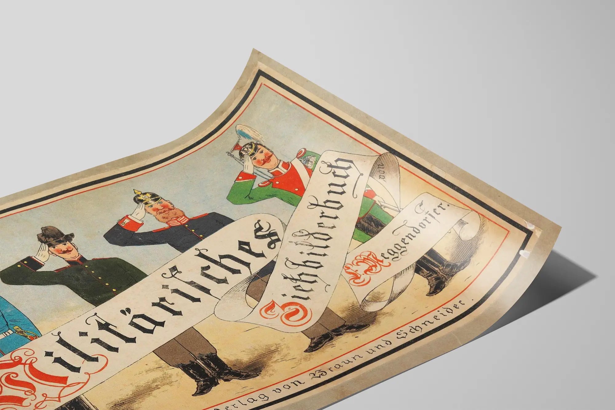 Deze vintage affiche toont een gestileerd militair tafereel met vier soldaten in historische uniformen die elkaar groeten. Elk draagt een onderscheidende uniform in levendige kleuren: blauw, donkergroen, marineblauw en lichtgroen, versierd met rode en witte details. De soldaten staan op een eenvoudige, lichte achtergrond, waardoor hun nauwkeurig afgewerkte uniformen met onder andere gouden knopen, witte riemen en diverse sierlijke hoofddeksels, waaronder een iconische puntmuts, mooi uitkomen. Een brede witte lint loopt horizontaal door de afbeelding, met een inscriptie in rode en zwarte gotische letters, wat een decoratief accent toevoegt aan deze muurversiering. Deze affiche heeft een oud grafisch stijl, die een historische en militaire sfeer oproept, perfect voor een thematische muurdecoratie in een vintage of industriële interieur. Ze brengt een gevoel van authenticiteit en karakter in uw ruimte, of het nu gaat om een kantoor, woonkamer of bibliotheek. De stijl en details maken het een decoratief stuk dat de aandacht trekt en toch elegant blijft. Deze militaire affiche is ideaal voor liefhebbers van originele muurdecoraties die kunst en geschiedenis combineren, en een unieke, symbolische sfeer creëren. Door voor deze muurversiering te kiezen, kiest u voor een poster met een oude charme, perfect om een muur te verrijken met een artistiek en historisch accent. Dit stuk is een mooi voorbeeld van een vintage militaire poster, die esthetiek en visueel verhaal combineert, ideaal voor liefhebbers van opvallende en thematische muurdecoraties.