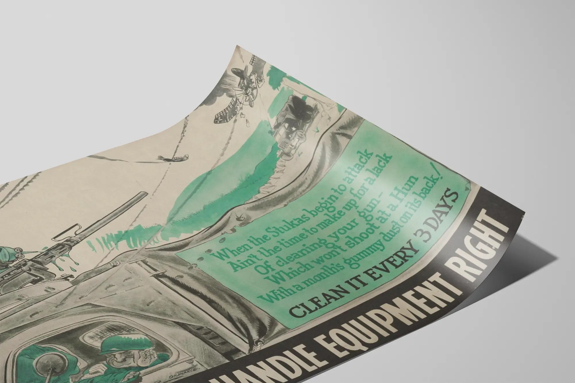 De tekst in het Engels waarschuwt voor het gebrek aan onderhoud van vuurwapens en benadrukt het belang van het reinigen van uw wapen om de drie dagen, zodat het correct functioneert tijdens een vijandelijke aanval. De waarschuwing wordt op een speelse manier gepresenteerd: « Wees geen sukkel! Handleer uitrusting goed » gevolgd door een gedicht dat eraan herinnert dat het verwaarlozen van het onderhoud fataal kan zijn.