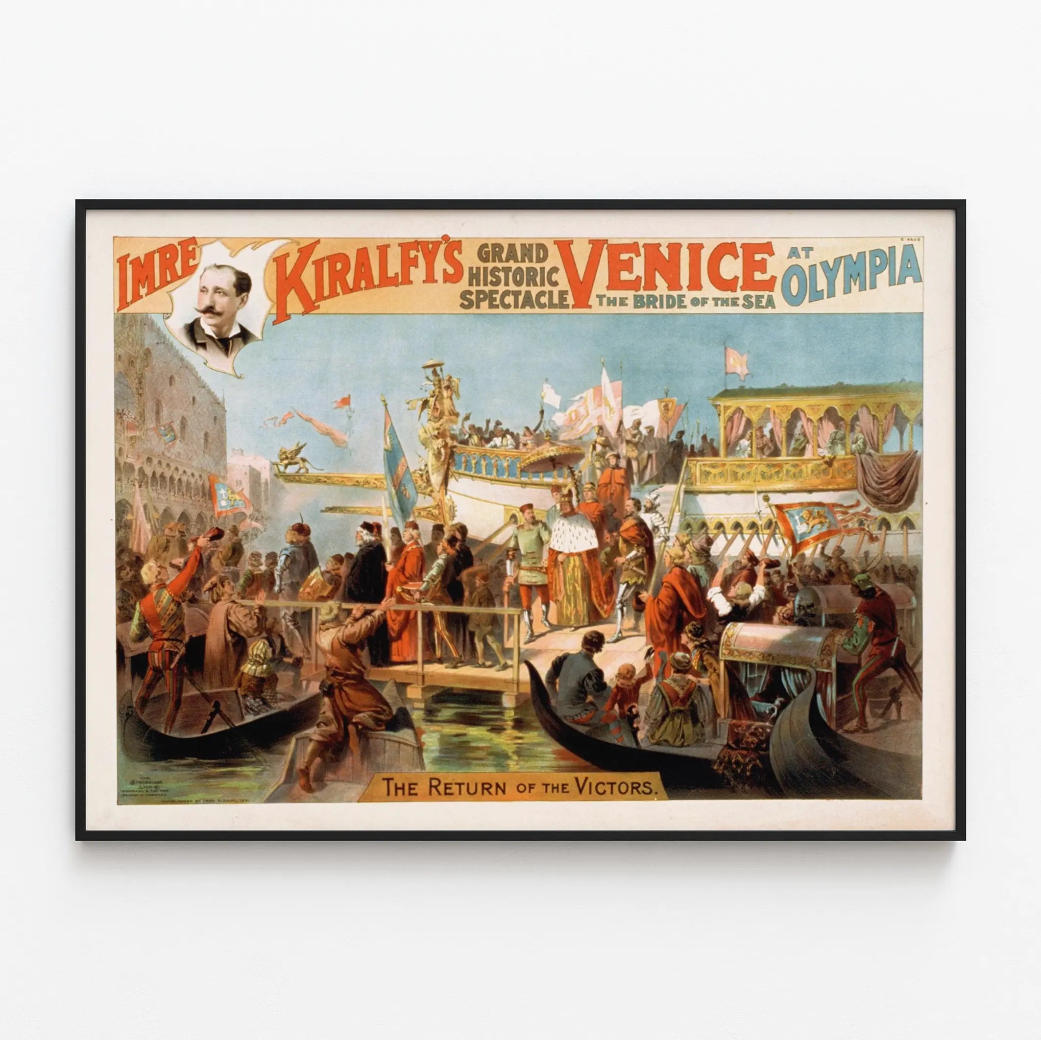 Ontdek deze vintage kunstdruk van een groot historisch spektakel getiteld « Venetië, de bruid van de zee bij Olympia », waarin een triomfantelijke terugkeer op de kanalen van Venetië wordt afgebeeld. Deze kleurrijke affiche toont een scène vol details, met personages in historische kostuums, versierde bootjes en vlaggen die wapperen, en creëert een feestelijke en majestueuze sfeer. Perfect voor een wanddecoratie met een oude inspiratie, roept deze kunstdruk elegantie en Venetiaanse cultuur op door middel van een zorgvuldig uitgevoerde artistieke voorstelling. Dit wandpaneel brengt een vleugje geschiedenis en authenticiteit in uw interieur, met zijn klassieke tinten en dynamische compositie. Ideaal voor liefhebbers van decoratieve kunst en cultuurhistorische enthousiastelingen, is deze vintage affiche een uniek stuk om uw woon- of werkruimte te personaliseren.