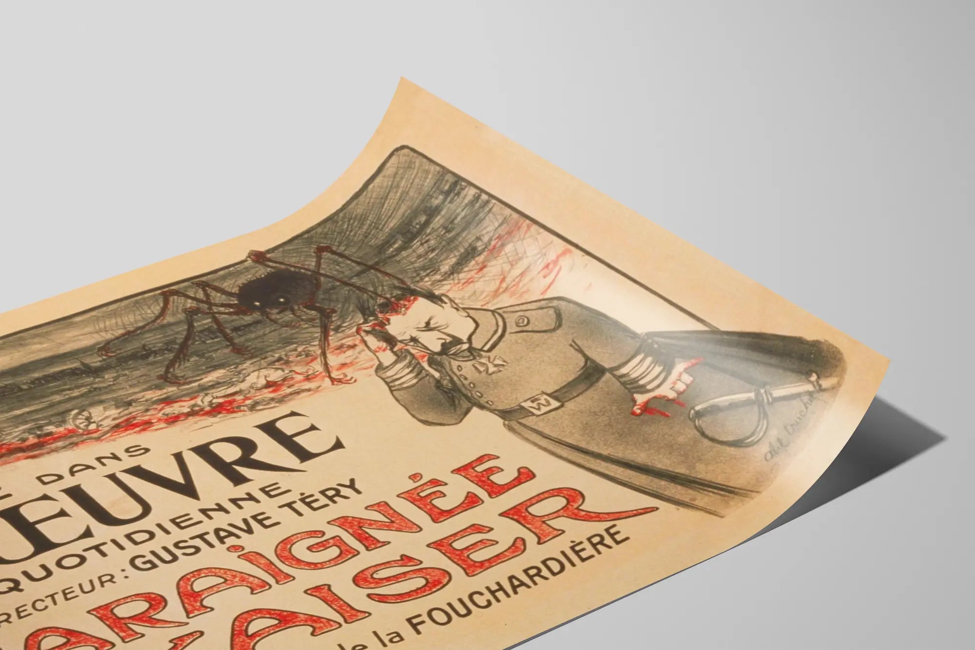 Deze vintage poster is een uniek stuk wanddecoratie in een oude en suggestieve stijl. Versierd met een fijn gekleurd potloodtekening, toont het een militair personage vergezeld door een grote zwarte spin die doet denken aan het werk « De Spin van de Keizer » van G. de la Fouchardière. De tekst promoot lezen in de dagelijkse krant "L’Œuvre" onder leiding van Gustave Téry. Deze poster combineert een sobere en expressieve grafische stijl, met rode accenten die de belangrijkste elementen van het beeld benadrukken, waaronder de titel van de roman en de bloederige details op de handen en de vloer, wat een dramatische en historische sfeer onderstreept. Ideaal voor liefhebbers van retrokunst, oude illustraties of militaire en literaire thema’s, brengt het een vleugje authenticiteit en een narratief belang in elke interieurstijl. Deze originele poster past perfect in een vintage wanddecoratie, of het nu in een woonkamer, kantoor of bibliotheek is, en biedt een rijk visueel element vol geschiedenis en symboliek. Ze onderscheidt zich door haar eenvoudige maar krachtige grafisch ontwerp, met klassieke typografie en expressieve tekening, waardoor het een kunstobject is om op te hangen als poster of wanddecoratie in een interieur dat een zowel literaire als historische uitstraling nastreeft.