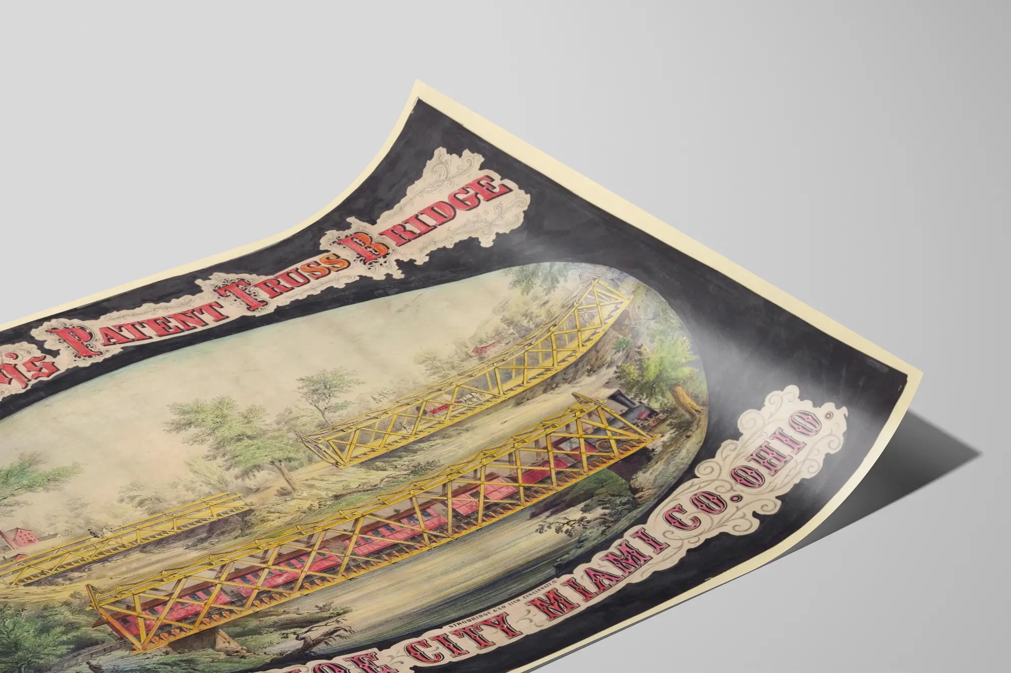 Deze unieke vintage poster belicht de gepatenteerde R.W. Smith trussbrug, gelegen in Tippecanoe City in Miami County, Ohio. Afgebeeld in delicate kleuren, toont deze illustratie drie gedetailleerde uitzichten van de brug, met de kenmerkende gele metalen structuur. De brug overspant een rustige rivier in een natuurlijke omgeving met groene oevers, bomen en heuvels op de achtergrond. Een stoomtrein rijdt door de hoofdscène, met personages en paarden die realisme en levendigheid aan de compositie toevoegen. De sierlijke rode en zwarte tekst omlijst de afbeelding, en brengt een historische en artistieke sfeer. Deze wanddecoratie is perfect voor liefhebbers van oude industriële architectuur, techniek of Amerikaanse geschiedenis. Ideaal om een muur te decoreren met een vleugje authenticiteit en een retrostijl, en nodigt uit tot het bewonderen van een uniek industrieel erfgoed. Verkrijgbaar als poster of schilderij, brengt dit stuk een vintage en technische sfeer in uw interieur of kantoor, voor liefhebbers van historische bruggen en metalen constructies.