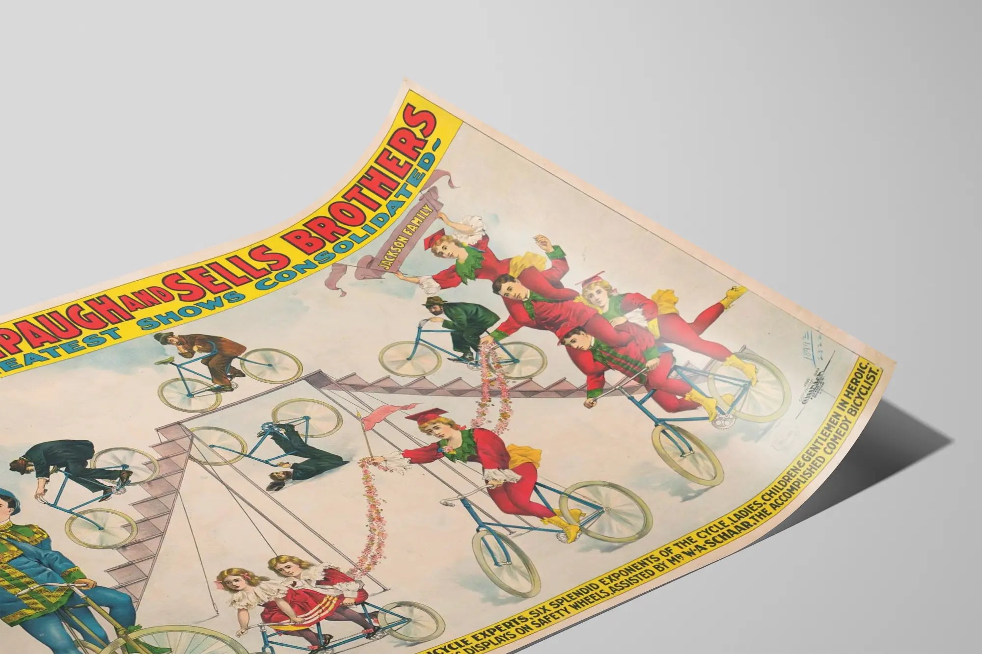 Ontdek deze prachtige vintage poster met een scène van The Adam Forepaugh en Sells Brothers, die het grootste Amerikaanse spektakel samenbrengt met de beroemde familie Jackson. Deze affiche, typerend voor circussen en reizende shows uit het einde van de 19e eeuw, toont een uitzonderlijke acrobatische prestatie op de fiets. Op deze wanddecoratie kunt u vele artiesten bewonderen, gekleed in kleurrijke kostuums, die balancerend en atletische figuren uitvoerend op fietsen, het talent en de creativiteit van deze artiesten uit die tijd illustreren. Dit wandpaneel is perfect om een retro en artistieke sfeer aan uw interieur toe te voegen, en roept de fascinerende wereld op van oude shows en circussen. De affiche heeft levendige kleuren en een gedetailleerde grafische stijl, waardoor het ideaal is als muurdecoratie voor liefhebbers van vintage kunst en historische show scènes. Deze wanddecoratie is een uitstekende keuze om een woonkamer, kantoor of een ruimte voor het verzamelen van artistieke objecten te personaliseren, met een authentiek karakter en een charme van vroeger. Een unieke wanddecoratie die de geest van de shows en de magie van acrobatische fietsoptredens vastlegt, en de esthetische en culturele waarde van die periode benadrukt. Perfect voor verzamelaars of voor wie een poster met een oude stijl wenst, rijk aan geschiedenis en visuele dynamiek. Dit kunstwerk als wanddecoratie is een levendig eerbetoon aan de artiesten en de wereld van reizende shows, met een dynamisch en feestelijk tafereel vol beweging en kleuren. Geef uw muren een affiche die een verhaal vertelt, waarbij de precisie van oude illustraties wordt gecombineerd met een boeiende en nostalgische sfeer.