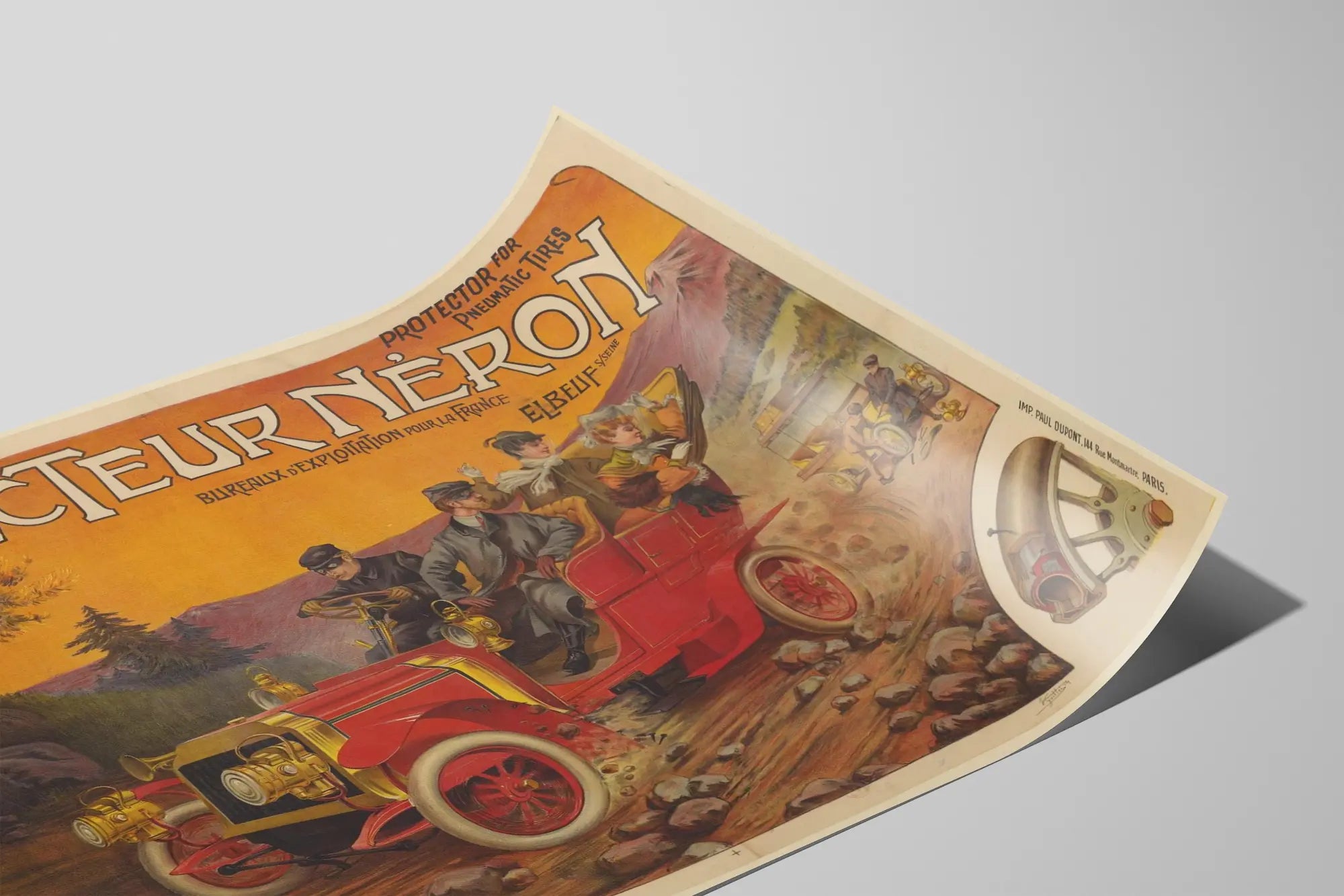 Ontdek dit vintage affiche getiteld « Protecteur Néron », een uniek stuk wanddecoratie geïnspireerd door de automobielwereld van het begin van de twintigste eeuw. Deze reclameposter benadrukt een beschermingsmechanisme voor luchtbanden, afgebeeld door een dynamische scène waarin een rode auto een kiezelweg overstak zonder de banden te beschadigen dankzij de Néron-beschermkap. De zeer gedetailleerde illustratie toont personages in ouderwetse kleding, wat de elegantie en het avontuur van autorijden in die tijd onderstreept. Deze poster vindt zijn plaats in een wanddecoratie voor liefhebbers van autogeschiedenis, vintage design of oude reclame. Het ontwerp benadrukt de stevigheid en innovatie van het product, terwijl het een retro charme behoudt, versterkt door warme kleuren en een typografie die typisch is voor Franse reclameborden van vroeger. Ideaal om een kantoor, garage of woonkamer te verfraaien, brengt dit decoratieve schilderij een vleugje authenticiteit en nostalgie in uw interieur. De voorstelling van de beschermkap voor banden op een close-up in de hoek van de affiche voegt een technische noot toe die liefhebbers van oude mechanica zal aanspreken. Deze vintage affiche past gemakkelijk in een industriële of retro wanddecoratiestijl, waarbij esthetiek en historische interesse worden gecombineerd. Voeg een uniek element toe aan uw verzameling posters met deze reclame uit Elbeuf, een visueel bewijs van de vindingrijkheid en stijl van toen, perfect om een ruimte te verrijken met een vleugje originaliteit en authenticiteit.