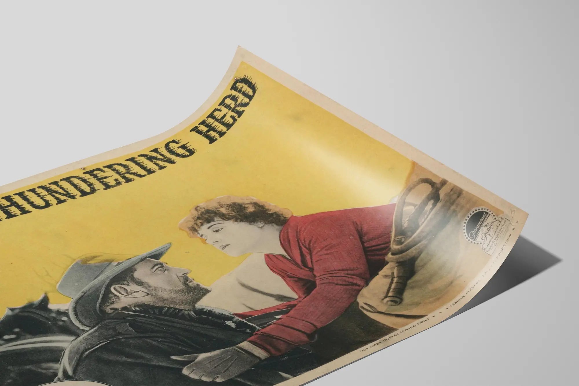 Ontdek deze iconische vintage poster getiteld "The Thundering Herd", geïnspireerd door het werk van Zane Grey. Deze oude affiche, voorzien van de inscriptie "A Paramount Picture", roept de charme op van de klassieke Amerikaanse cinema. Op een heldergele achtergrond toont dit beeld een baardige man met een cowboyhoed en een vrouw gekleed in rood, die een moment van emotionele intensiteit vastlegt. De westernsfeer wordt versterkt door elementen zoals het paard op de achtergrond en de accessoires uit die tijd, waardoor een muurdecoratie ontstaat met een authentiek en retro karakter. Dit schilderij, perfect voor liefhebbers van klassieke cinema en vintage decoratie, brengt een vleugje nostalgie en geschiedenis in uw interieur. Gebruik deze poster als blikvanger in een woonkamer of kantoor om een warme en boeiende sfeer te creëren die een verhaal vertelt. De gestileerde typografie bovenaan de affiche voegt een interessante grafische dimensie toe, wat het visuele aantrekkingskracht van deze muurdecoratie versterkt. Of u nu een fan bent van westerns of gewoon op zoek bent naar een originele affiche, dit unieke stuk is een uitstekende keuze om uw muren te verrijken met een tijdloze en elegante stijl.