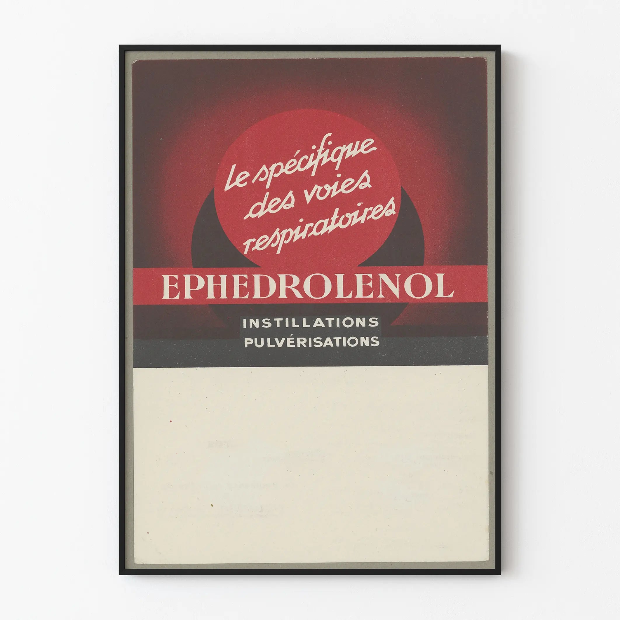 Deze vintage poster Ephedrolenol is een uniek wanddecoratiestuk vol geschiedenis. Het grafische ontwerp benadrukt een rode cirkel en witte typografie op een donkere achtergrond, wat zorgt voor een krachtig en aantrekkelijk contrast. De boodschap "het specifiek voor de luchtwegen" evenals de termen "instillaties" en "vernevelingen" geven aan dat deze poster reclame maakte voor een medicinale product bedoeld voor de verzorging van de luchtwegen. Deze affiche is een uitstekende keuze voor liefhebbers van retro wanddecoratie, die esthetiek en historische referentie aan de ademhalingsgezondheid combineren. Deze vintage poster past perfect in een modern of klassiek interieur, en brengt een authentieke toets en een diepe rode kleuraccent. Met zijn langwerpige formaat is hij geschikt voor een lege muur in een kantoor, woonkamer of een ruimte gewijd aan gezondheid en welzijn. Ideaal voor wie wil decoreren met unieke elementen geïnspireerd door oude medische reclame. Dit product nodigt uit om een grafische stijl van vroeger te ontdekken, via een affiche met eenvoudige maar doeltreffende lijnen. Een echt reclamepaneel dat vorm en functie combineert, waardoor deze Ephedrolenol poster een volwaardig decoratief object is. Deze vintage affiche kan ook in de smaak vallen bij verzamelaars van oude posters, evenals bij liefhebbers van medische geschiedenis en visuele communicatie.