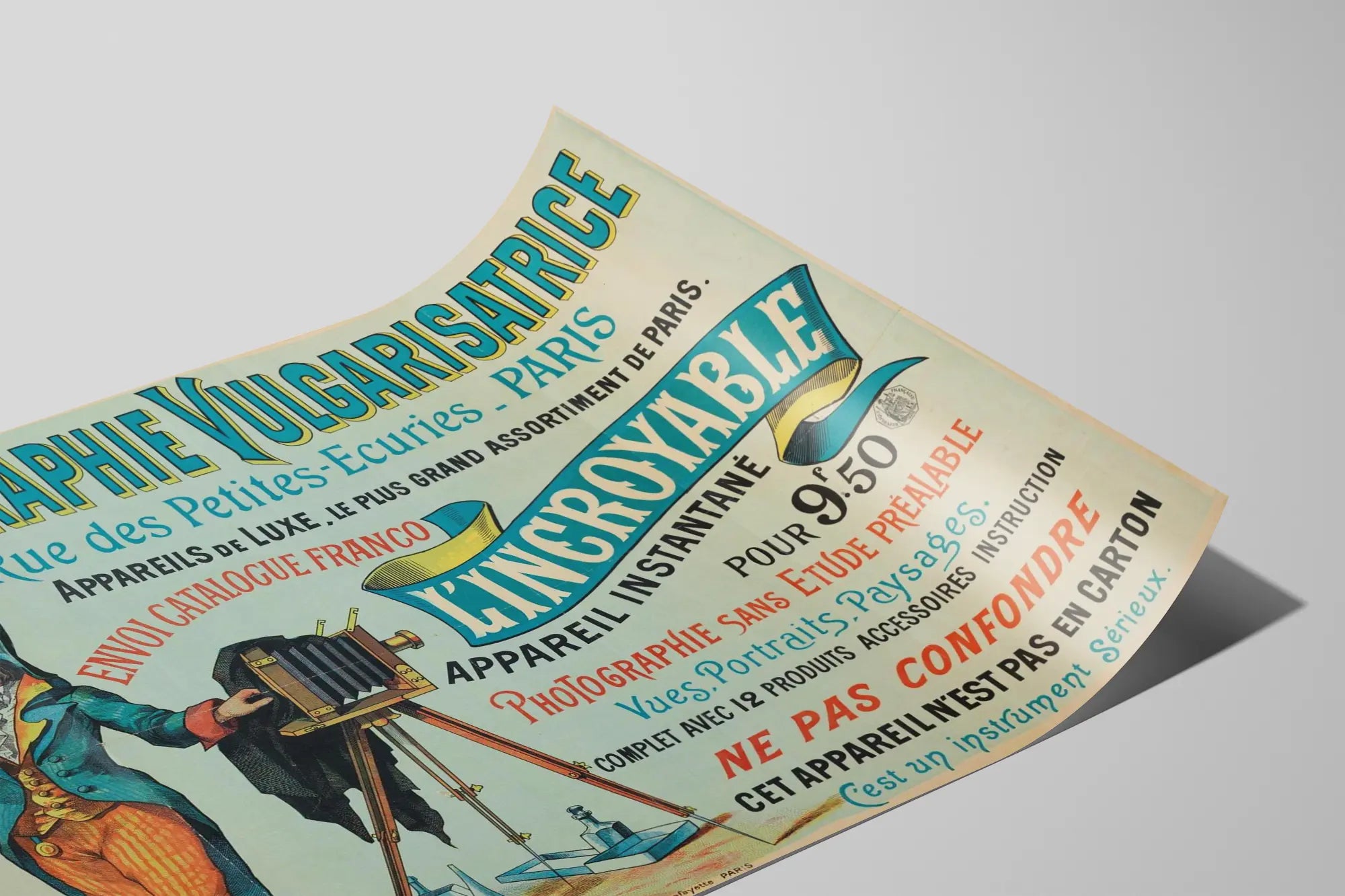 Deze vintage poster getiteld "Fotografie Vulgarisatrice" is een charmante muurdecoratie, ideaal voor liefhebbers van de geschiedenis van de fotografie en retro design. Afgedrukt in levendige kleuren, toont het een oud camera op statief en een figuur gekleed in een historische outfit, wat de stijl van de begin 20e-eeuwse advertenties weerspiegelt. De tekst op de poster vermeldt een "instant camera" genaamd "de ongelooflijke", waarmee de originaliteit wordt benadrukt door een gevarieerd en kleurrijk typografie die onmiddellijk de aandacht trekt.