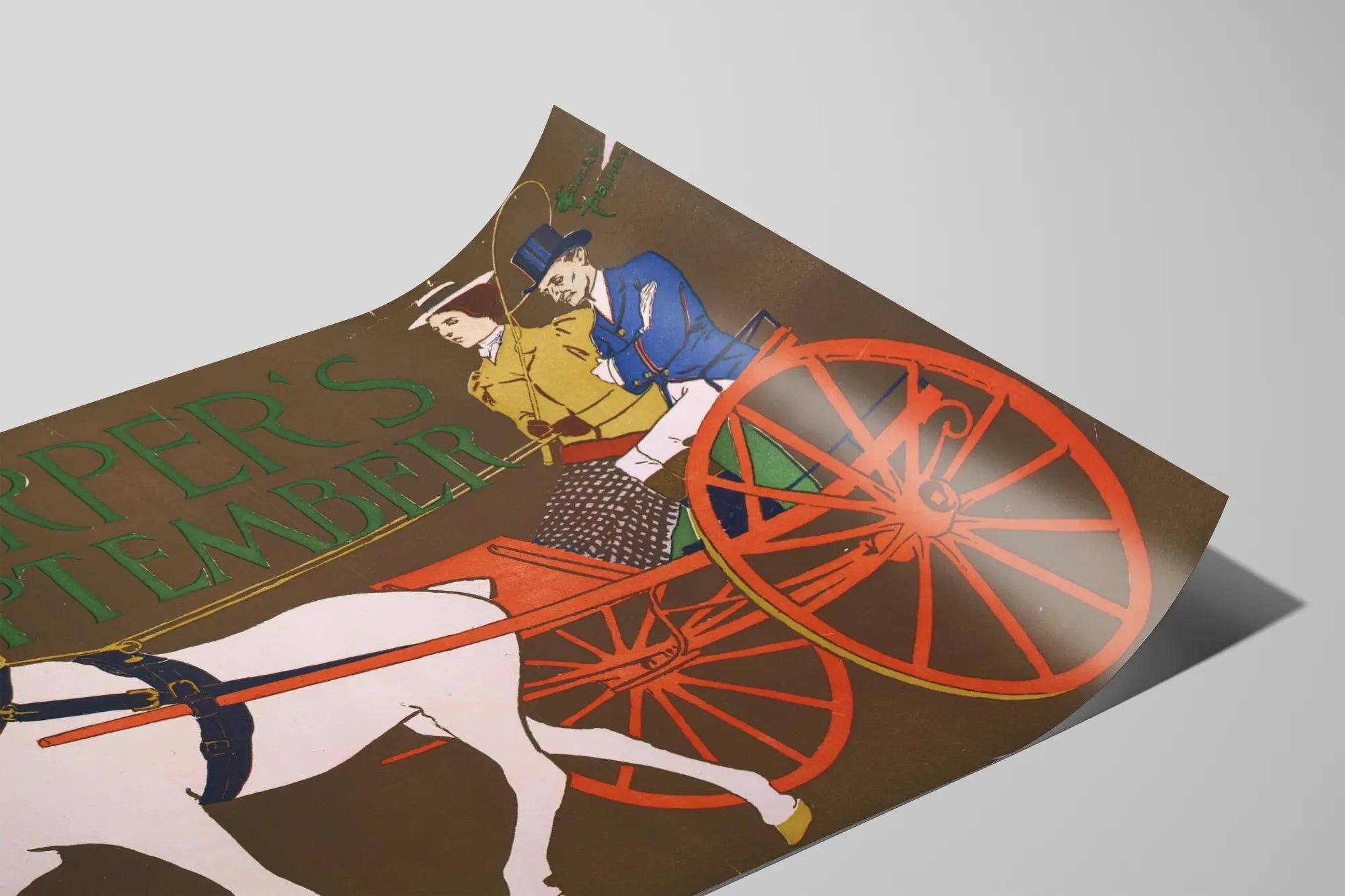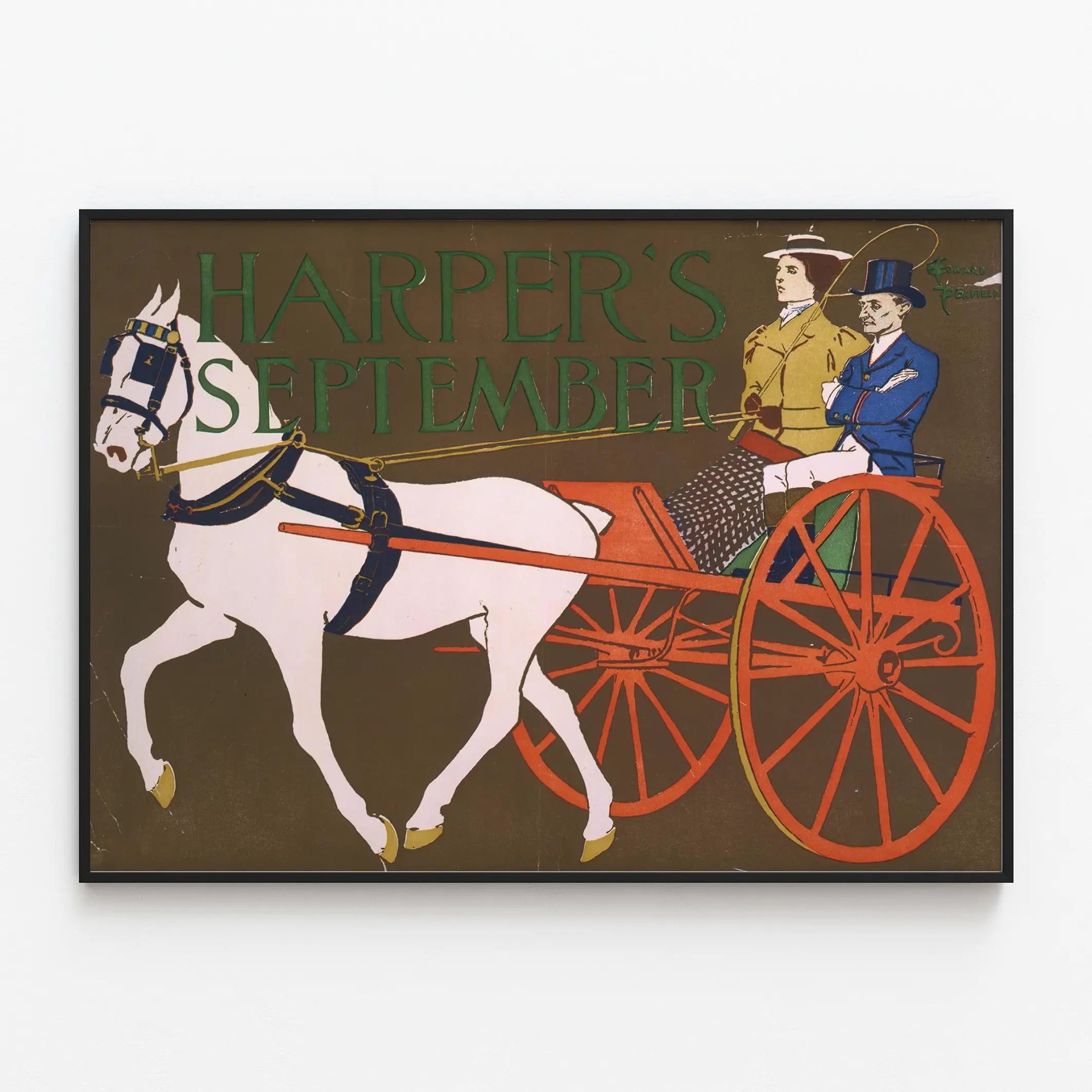 Deze vintage affiche toont een elegante en klassieke scène van een koets getrokken door een witte paard, vergezeld door twee personen gekleed in oude stijl. De effen bruine achtergrond benadrukt het stralende wit van het paard, de oranje wielen van de koets en de kleurrijke kleding van de reizigers. De tekst "HARPER'S SEPTEMBER" in groene hoofdletters, goed leesbaar, voegt een krachtig grafisch accent toe en contrasteert met de soberheid van de achtergrond. Deze poster biedt een artistieke en tijdloze muurdecoratie, ideaal voor liefhebbers van retro patronen en historische sferen. Ze past perfect in een interieur met een klassieke, vintage stijl of in een ruimte gewijd aan lezen en cultuur. Deze muurafdruk, door haar kleuren en eenvoudige ontwerp, brengt een vleugje verfijning en nostalgie, en verrijkt de inrichting van een kamer op een subtiele en elegante wijze. Perfect om een lege muur te decoreren, deze poster stimuleert de verbeelding door een reis door de tijd en een rustige sfeer op te roepen. Een muurdecoratie om te verzamelen voor alle liefhebbers van oude illustraties en retro-esthetiek.