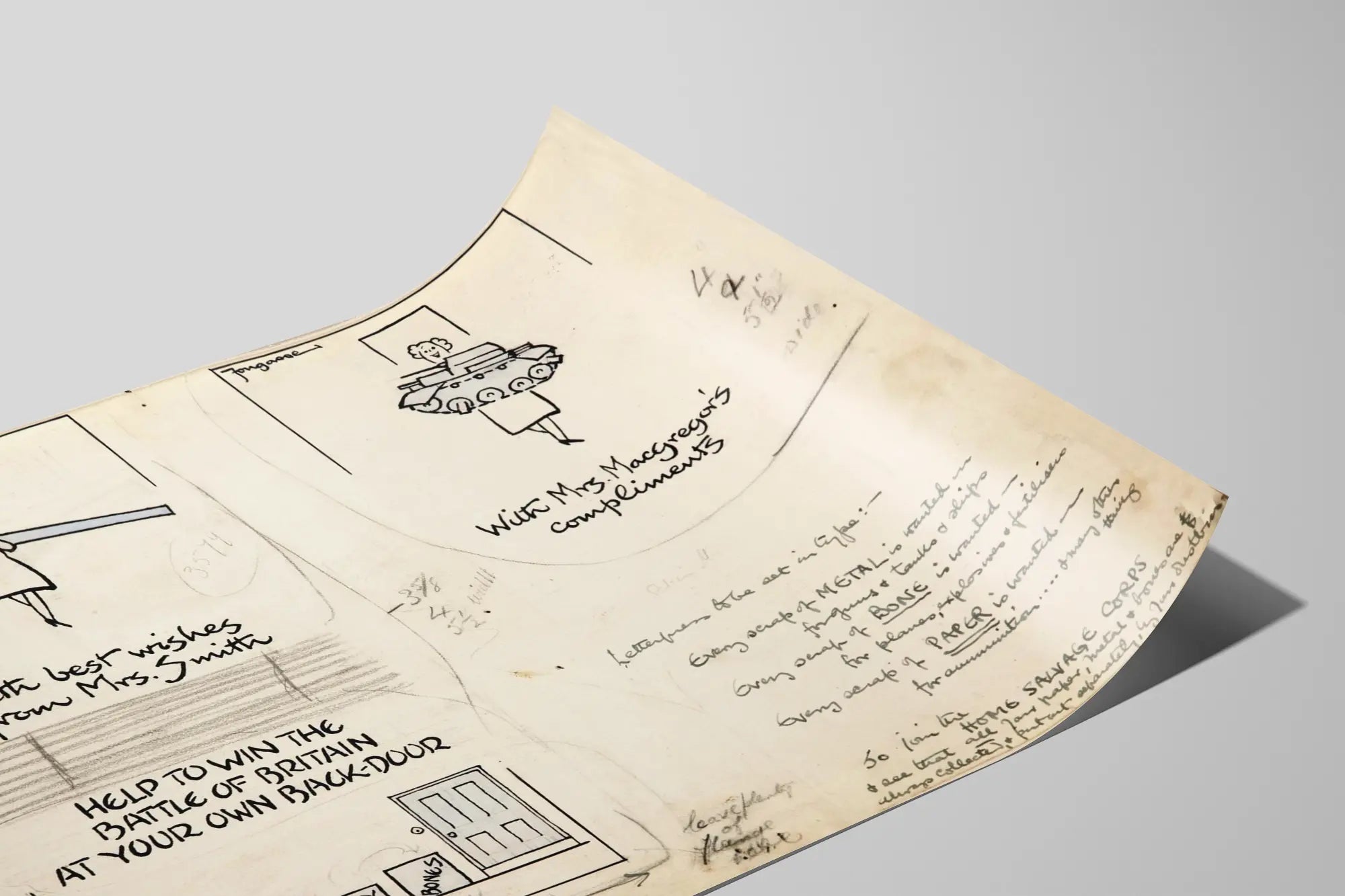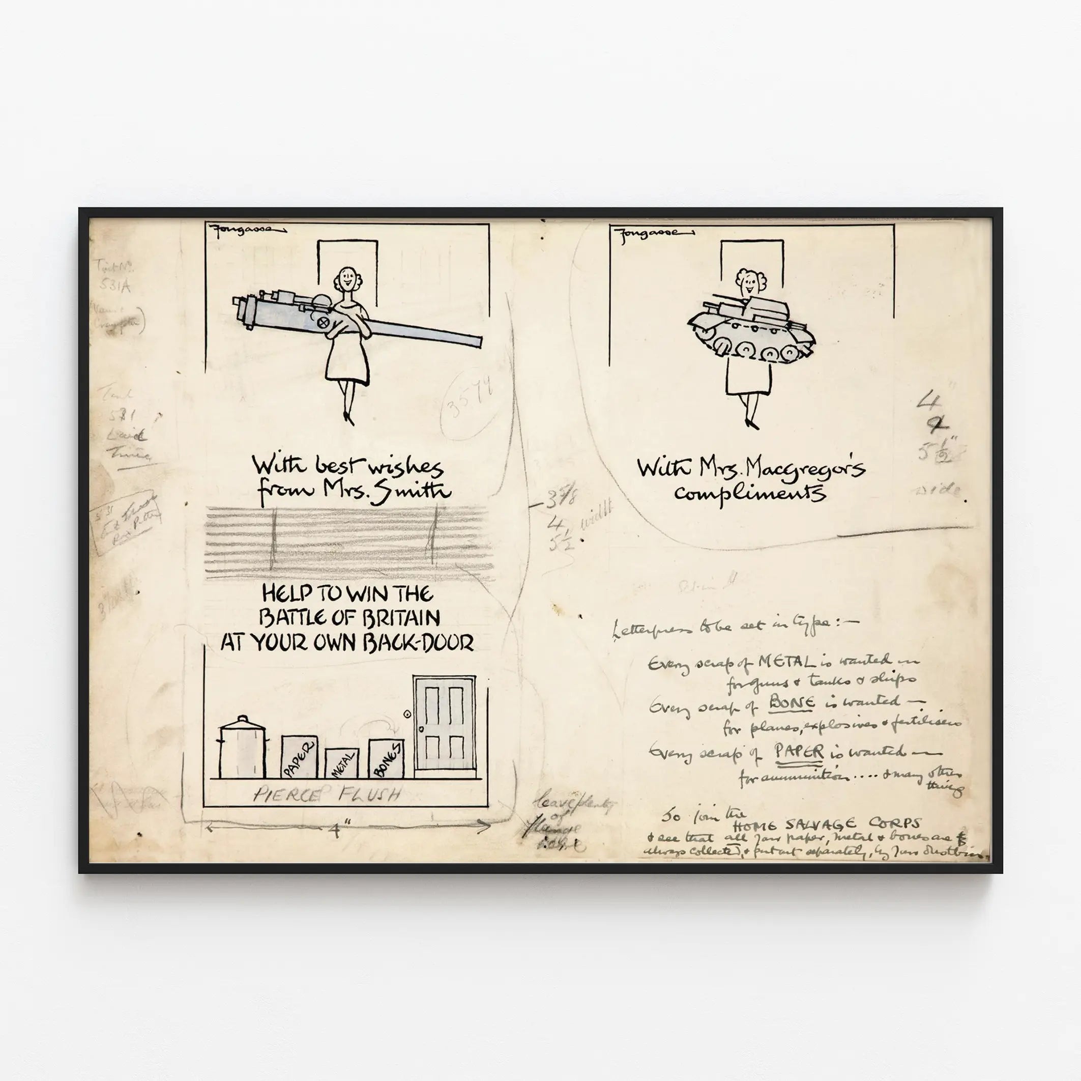 Ontdek deze vintage poster met een humoristische en geëngageerde stijl, die een oproep tot mobilisatie voor het Home Salvage Corps tijdens de Slag om Engeland afbeeldt. Deze poster onderscheidt zich door een zwart-wit tekening van een vrouw die ofwel een antitankkanon of een miniatuur tank draagt, wat de cruciale rol van materiaalrecycling voor de oorlogsinspanningen symboliseert. De compositie is eenvoudig en rechtlijnig, met een duidelijke boodschap: "Help de Slag om Engeland te winnen, bij u achter de deur." Onderaan benadrukken etiketten met « Papier », « Metaal », « Bot » het belang van sorteren en verzamelen van recyclebare grondstoffen voor de fabricage van wapens, vliegtuigen, explosieven en munitie. Deze poster is perfect voor een interieur met een retro of historische wanddecoratie, en brengt een vleugje herinnering en grafisch ontwerp uit het midden van de twintigste eeuw. Ze vindt haar plek zowel in een kantoor, bibliotheek als woonkamer, voor liefhebbers van propagandaposters en volkskunst. Haar handgeschreven notities voegen een authentieke charme toe die verzamelaars en geschiedenisliefhebbers zal aanspreken. Gun jezelf deze unieke poster om je muurdecoratie te verrijken met een object dat een sterke visuele en symbolische impact heeft.
