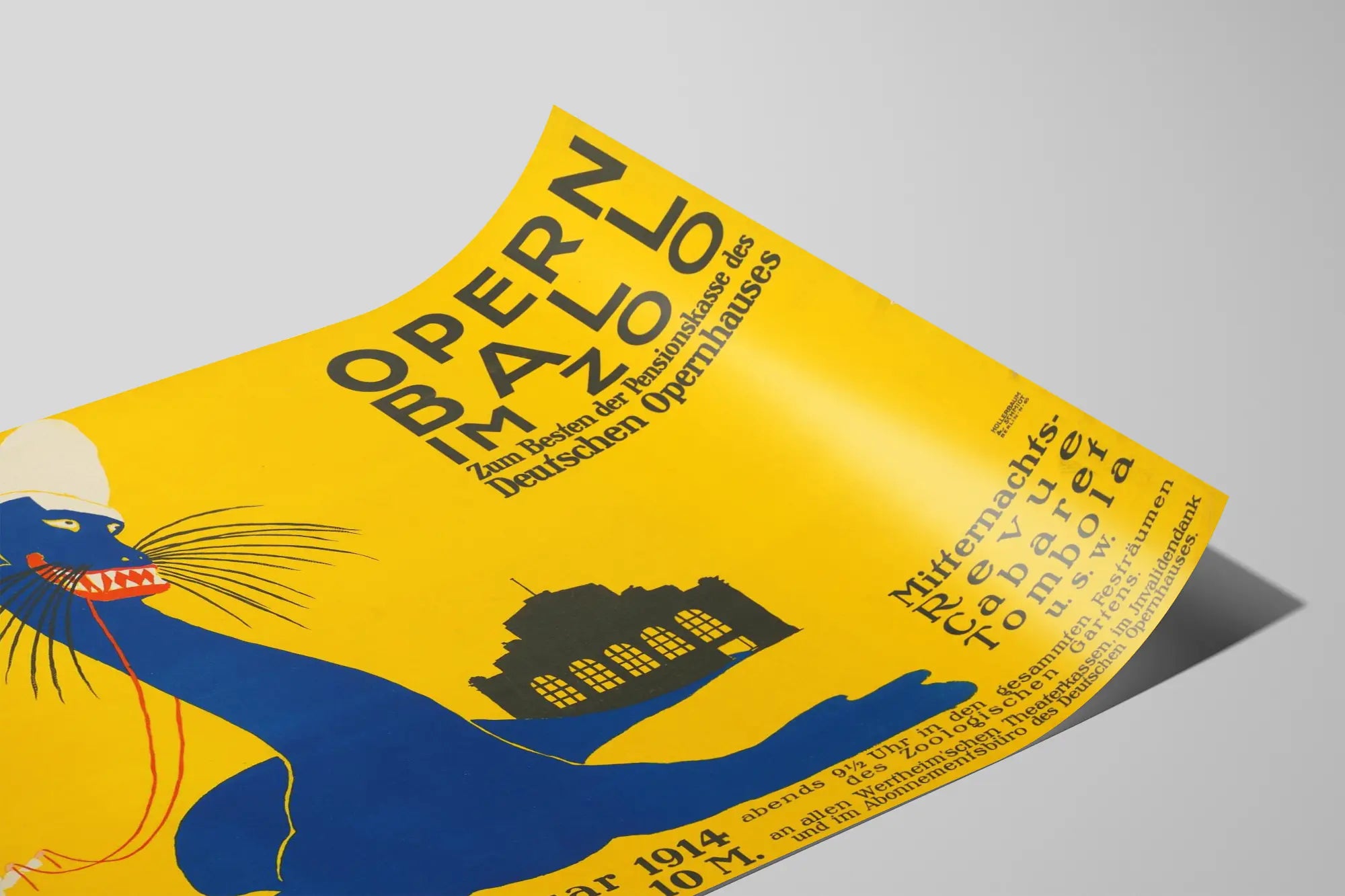 Deze affiche met artistieke en typografische stijl uit de periode roept een culturele gebeurtenis op — een operabal in de dierentuin — die plaatsvond op 26 januari 1914 in Berlijn, zoals de Duitse tekst aangeeft. De retro-esthetiek, eenvoudige vormen en het gebruik van primaire kleuren maken van deze poster een perfect stuk voor liefhebbers van grafische kunst uit het begin van de twintigste eeuw.