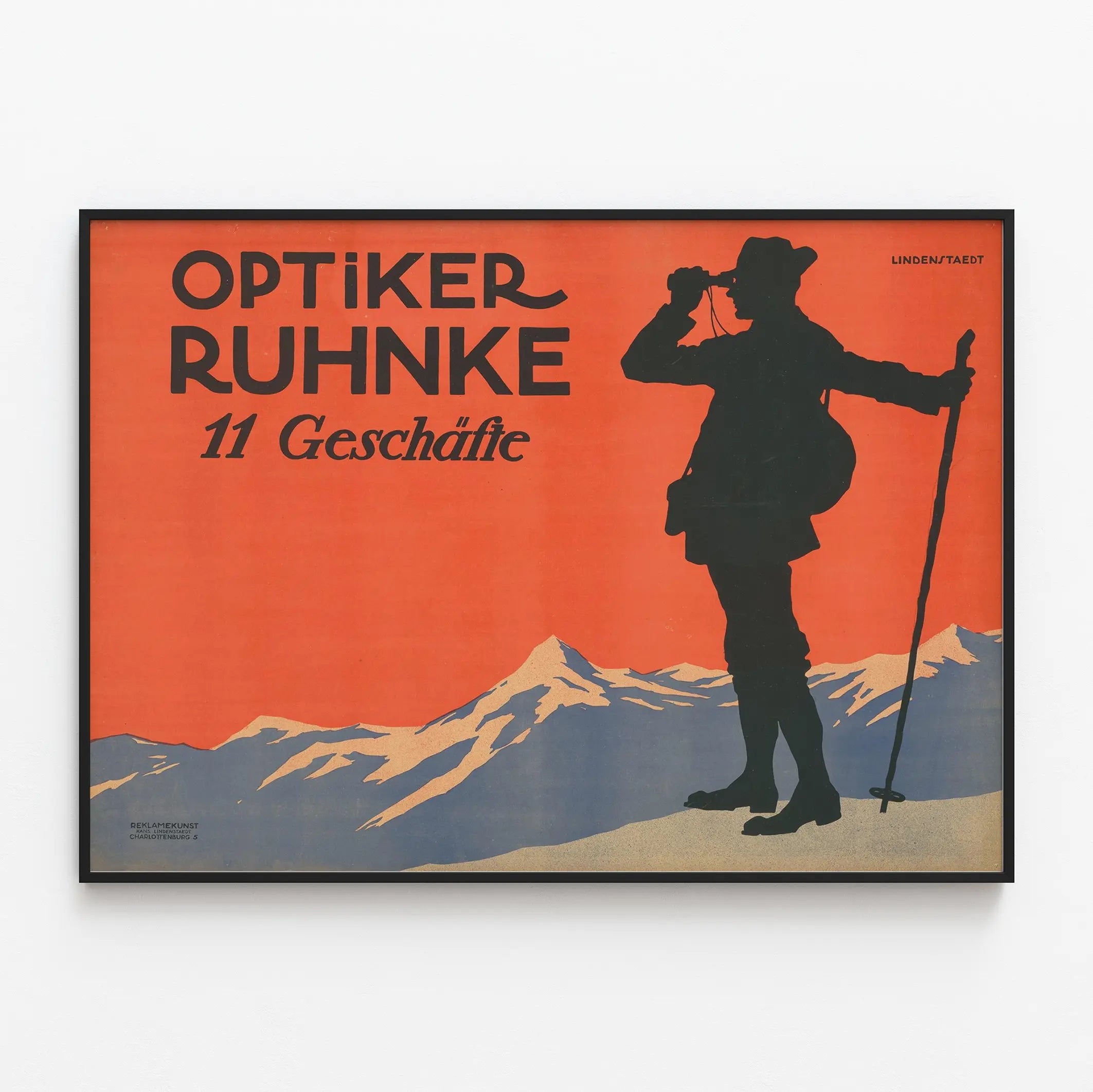 Vintage poster van opticien Ruhnke silhouet wandelaar en berg